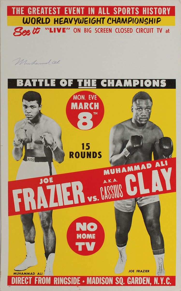 Color 14 x 22 cardstock poster for the Ali–Frazier fight at Madison Square Garden on March 8, 1971, signed in the upper border in blue ballpoint by Ali. In fine condition, with a couple mild creases.