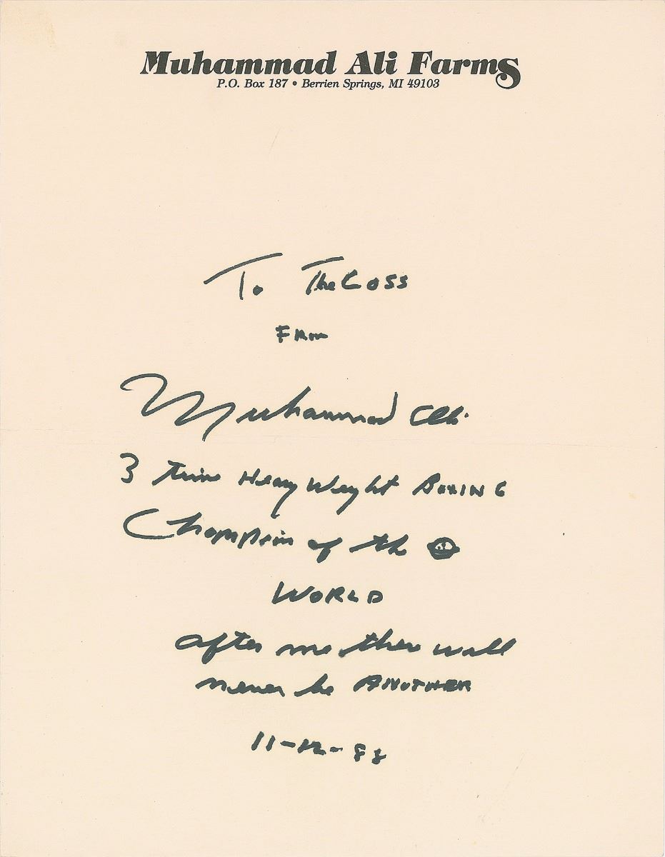 AQS on an off-white 8.5 x 11 sheet of Muhammad Ali Farms letterhead, signed and inscribed in black felt tip, “To the Coss, from, Muhammad Ali, 3 time heavyweight boxing champion of the world, after me there will never be another, 11-12-88.” In fine condition.