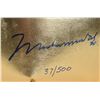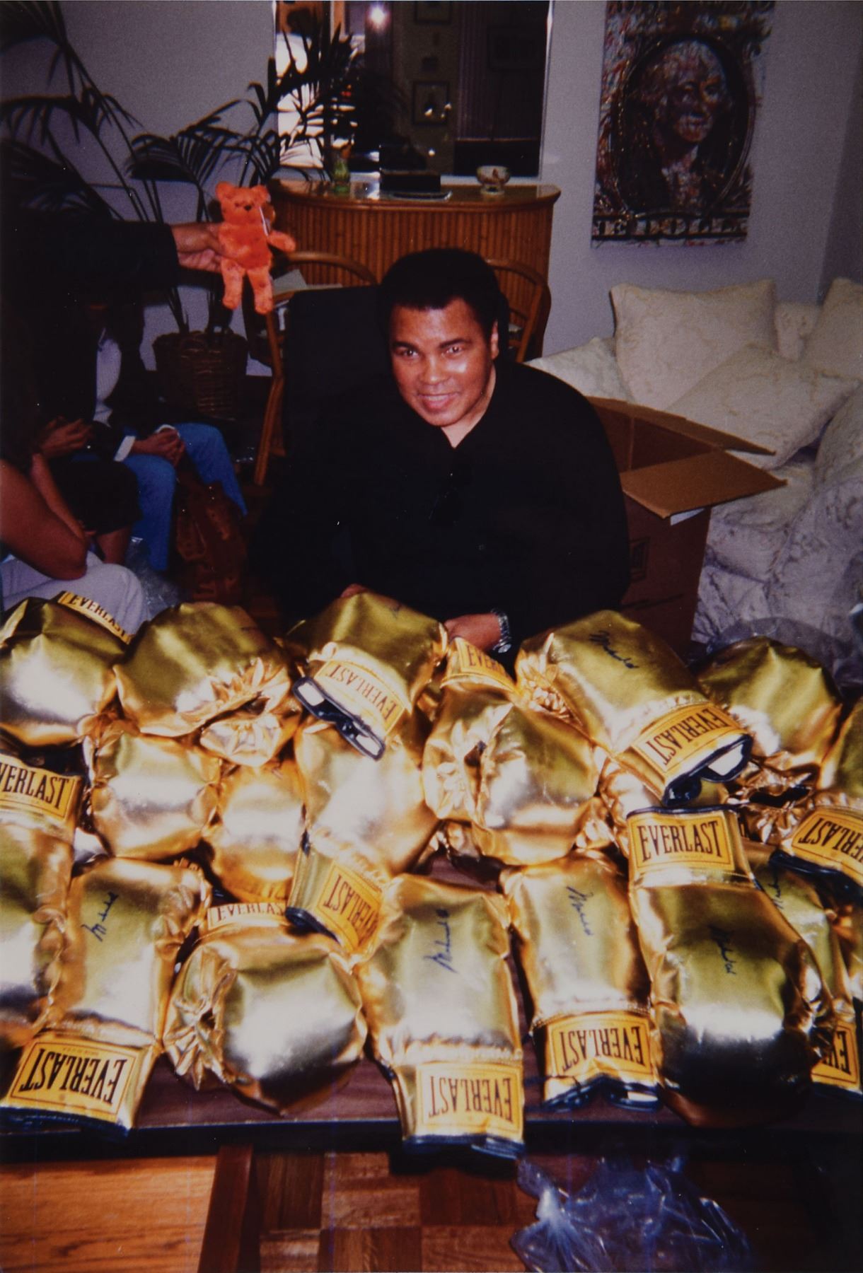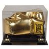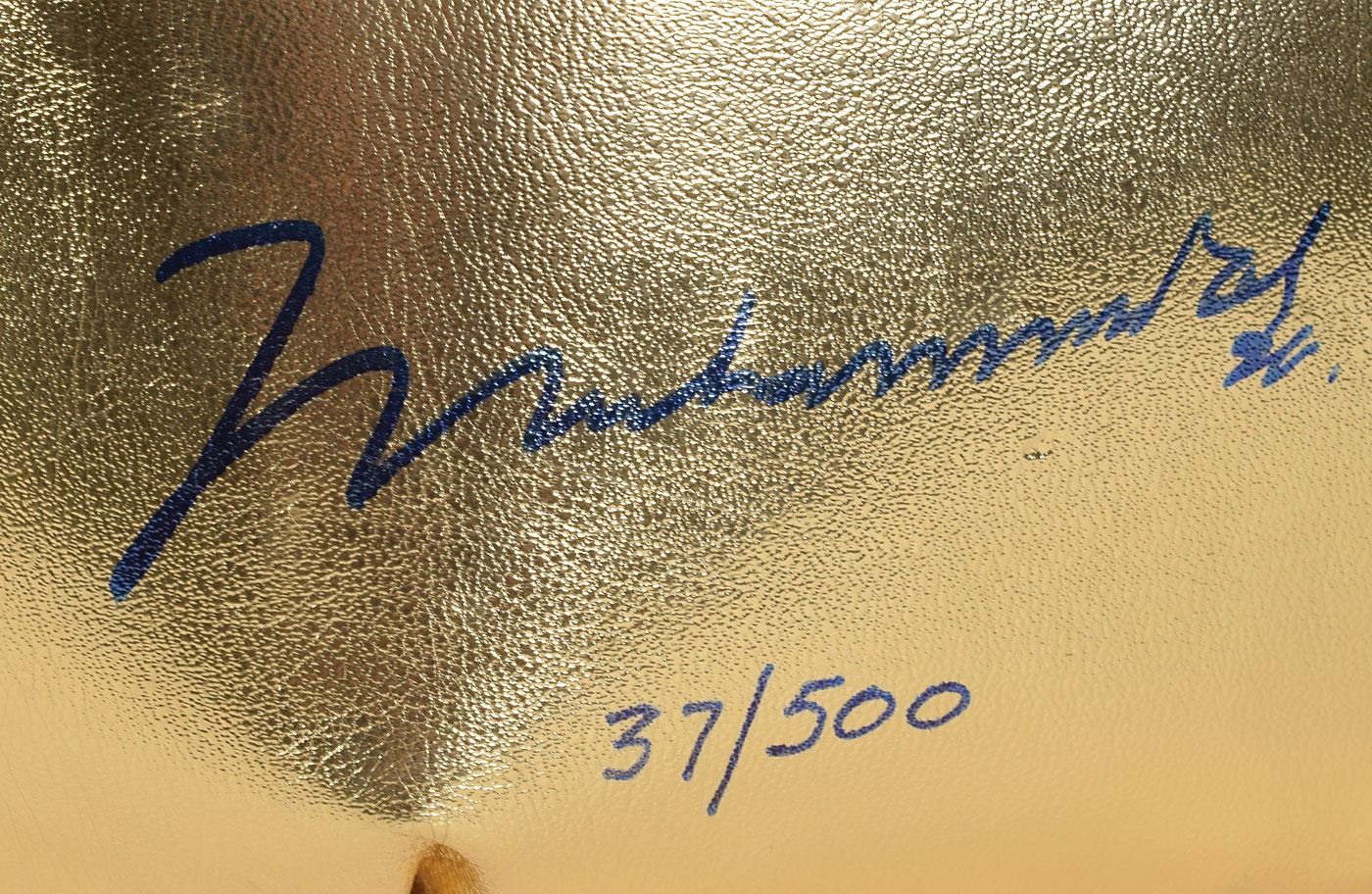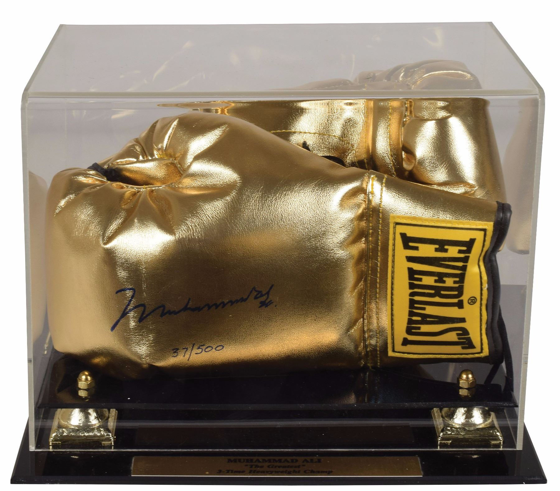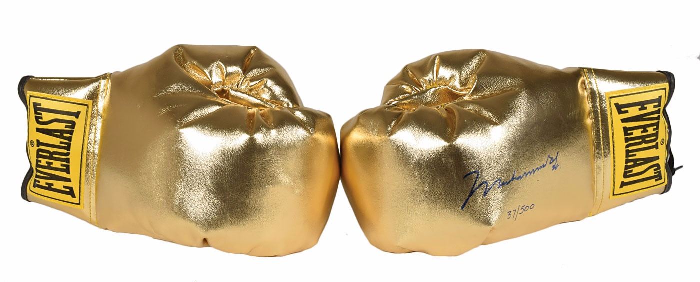Gorgeous limited edition pair of golden Everlast boxing gloves, numbered 37/500, signed on the left glove in blue felt tip by Ali. In fine condition. Accompanied by a display case with affixed plaque, a certificate of authenticity, and a photo taken at the time of signing.