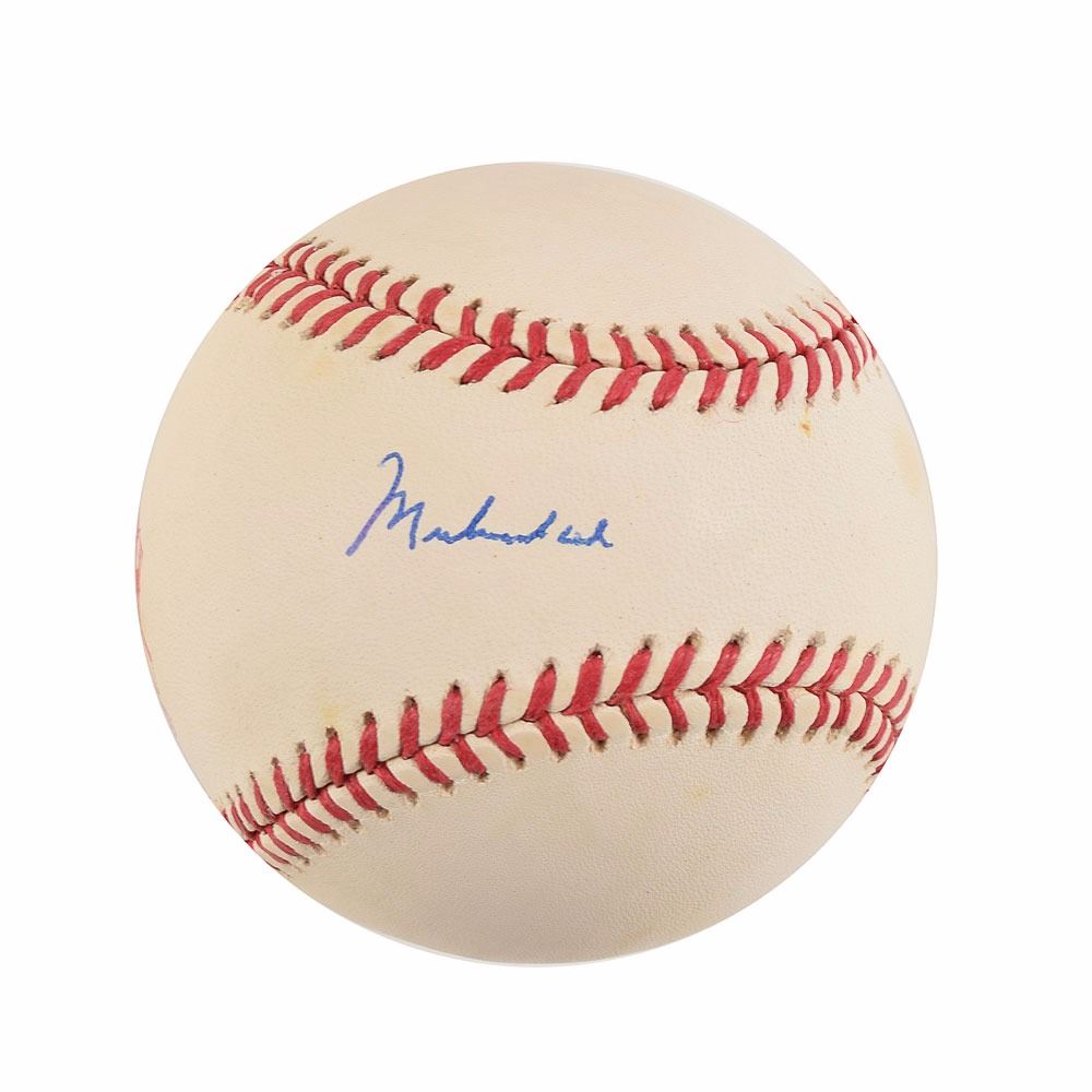 Official Rawlings World Series League baseball from 1994, signed in blue ballpoint on the sweet spot by Muhammad Ali. In fine condition, with a JSA label affixed near the league stamp. Accompanied by a full letter of authenticity from JSA.