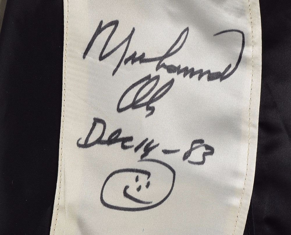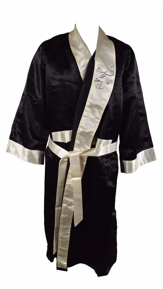 Full-length black-and-white Everlast boxing robe with "Muhammad Ali" in white lettering on the reverse, size 42, signed on the white lapel in black felt tip, "Muhammad Ali, Dec 14-83," with a small smiley face sketch. In fine condition. Accompanied by a full letter of authenticity from JSA. The consignor notes that this was obtained at a show where Ali was selling and signing the robes.