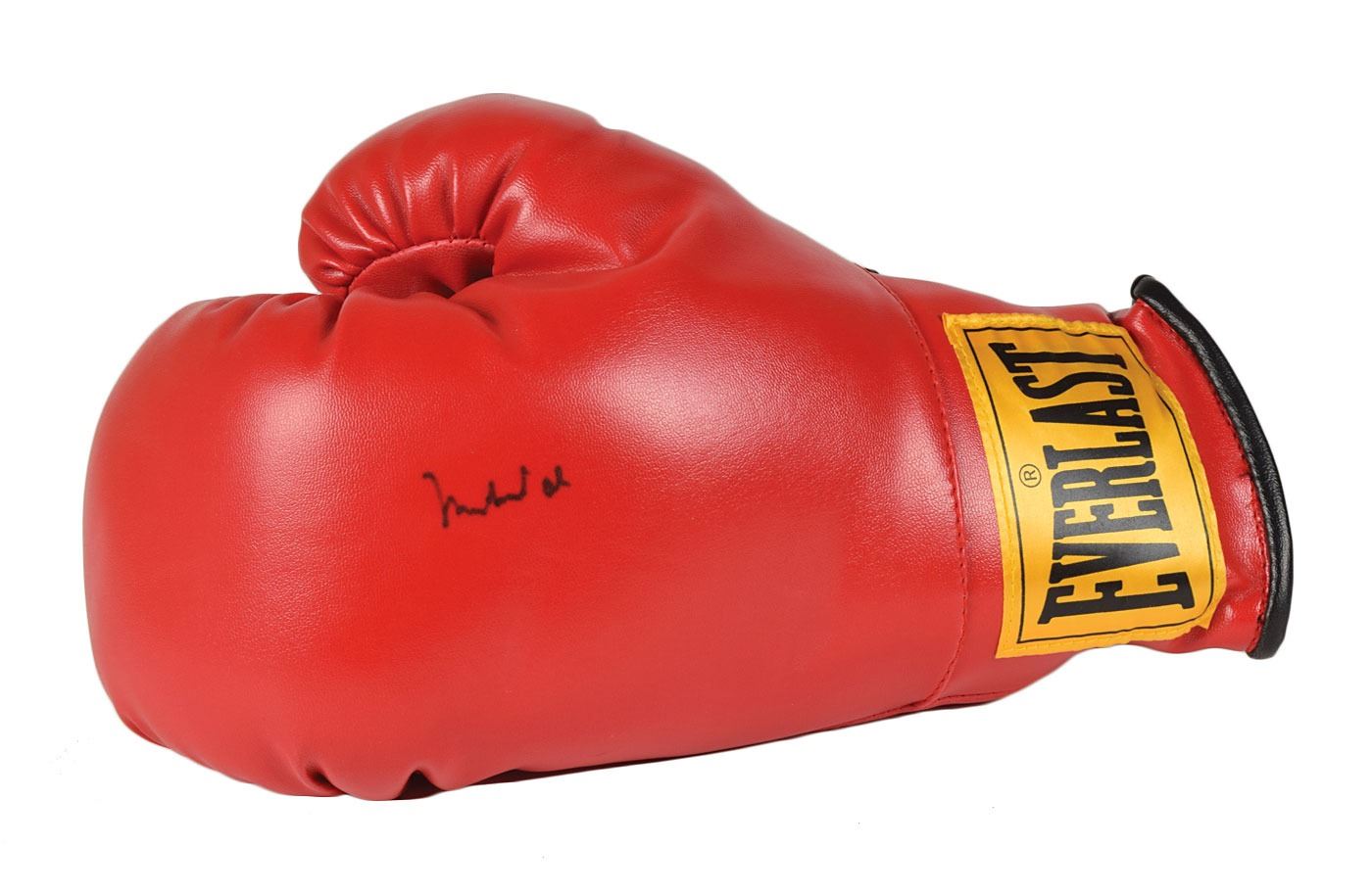 Red left-handed Everlast 12-ounce boxing glove, signed on the top in black felt tip by Muhammad Ali. In fine condition. Originally obtained by in-person specialist Mike Wehrmann.
