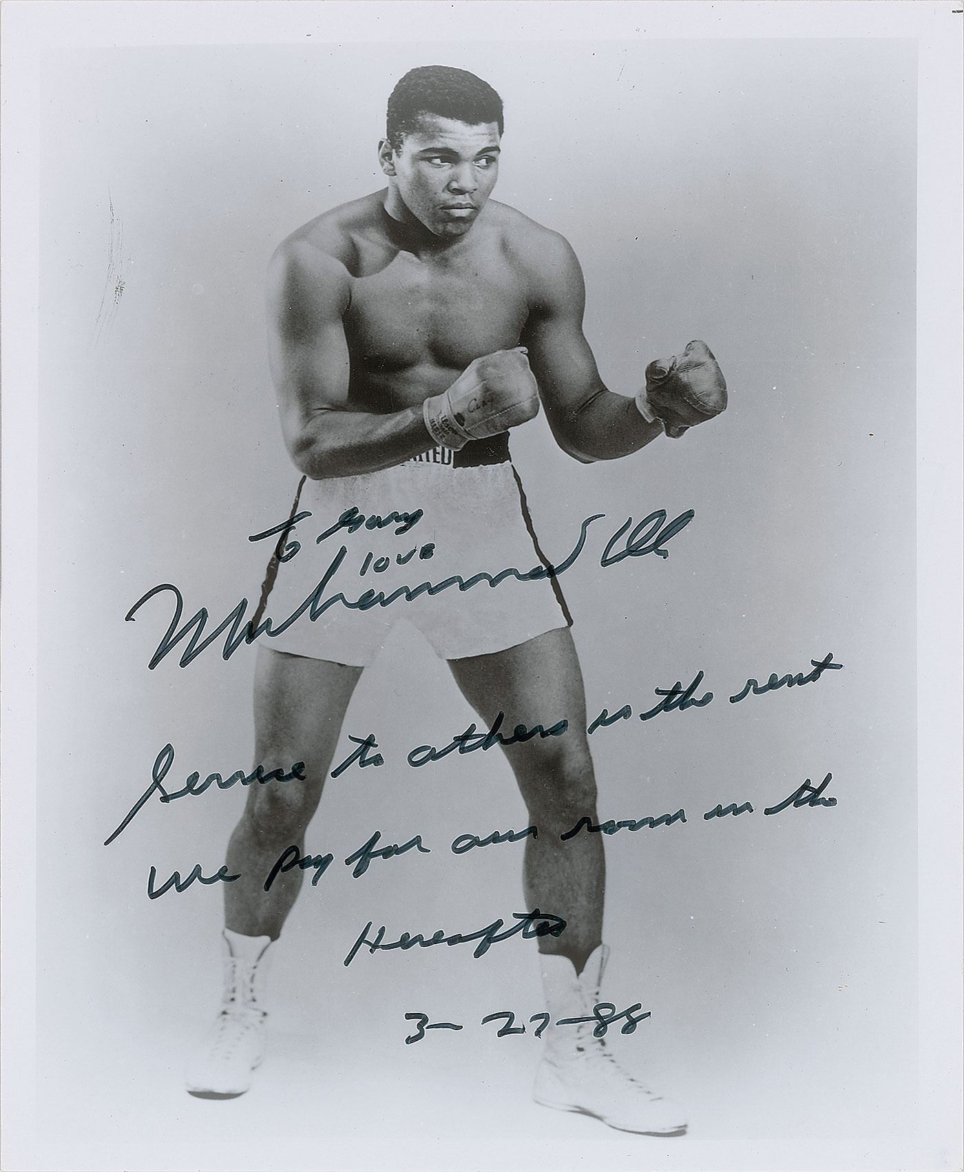 Glossy 8 x 9.75 full-length photo of Ali in a pugilistic pose, signed and inscribed in black felt tip, "To Gary, love, Muhammad Ali, Service to others is the rent we pay for our room in the Hereafter, 3–27–88.” In fine condition, with a light bend to the lower right corner.