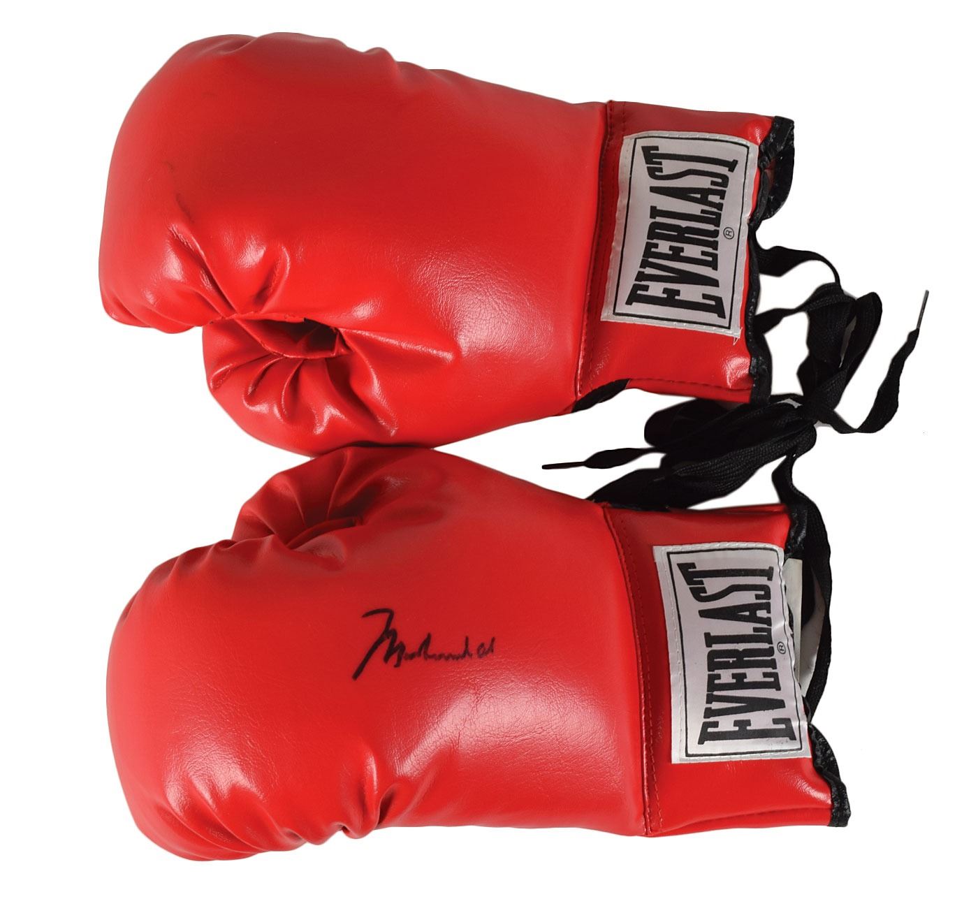 Attractive pair of red Everlast 14-ounce boxing gloves, signed on the top of the left-handed glove in black felt tip by Ali. In fine condition. Accompanied by a laminated admission ticket for a 'cocktail hour and dinner' with Muhammad Ali at a Holiday Inn Trade Center on May 11, 1995.