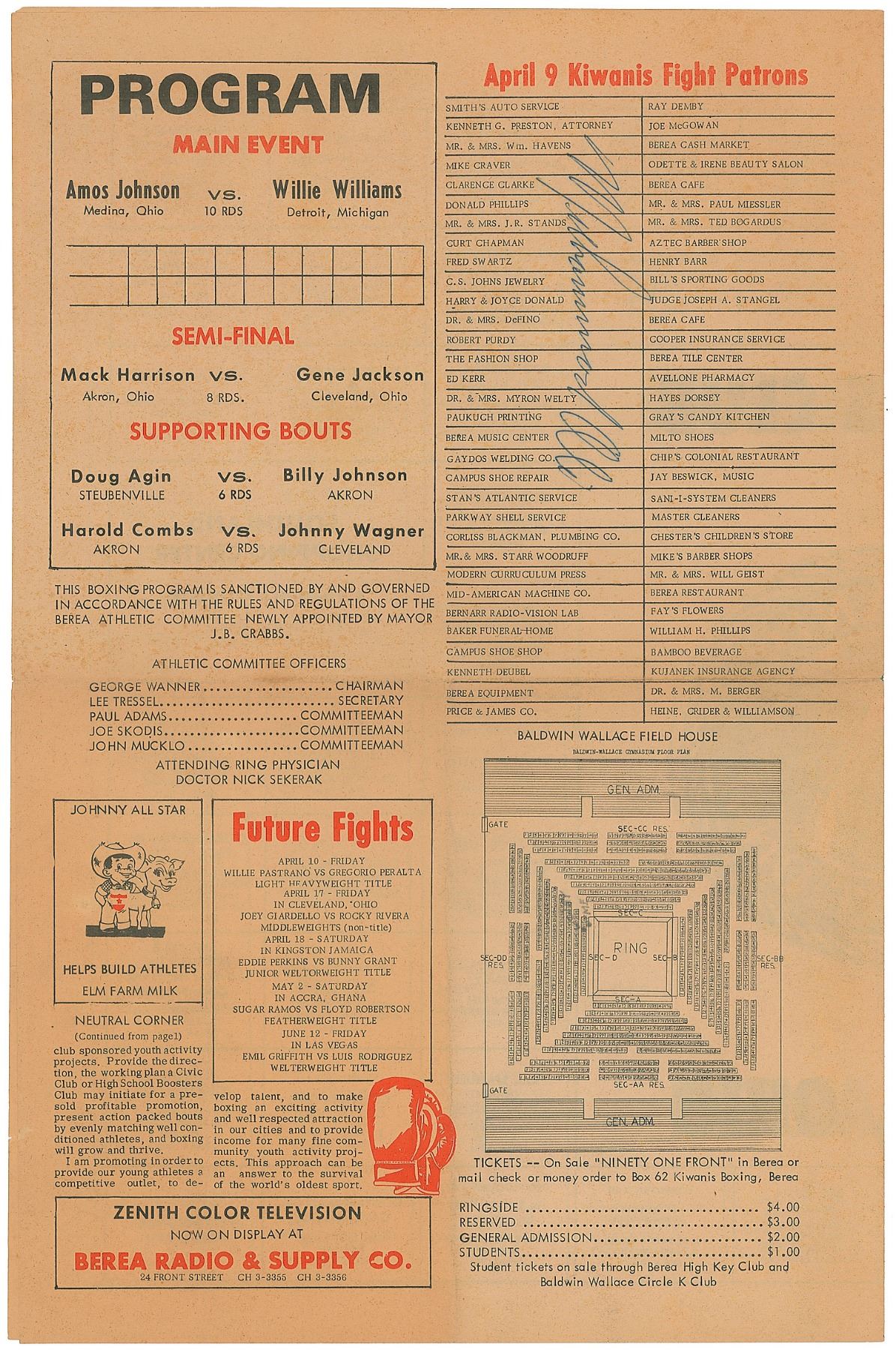 Official program for a boxing event at the Baldwin–Wallace Field House in Berea, Ohio, on April 9, 1964, four pages, 11.25 x 17, vertically signed on the back page in black ballpoint by Ali as the heavyweight champ. In very good to fine condition, with light overall toning and a short edge tear. Accompanied by three glossy photos of Ali seated at the event.