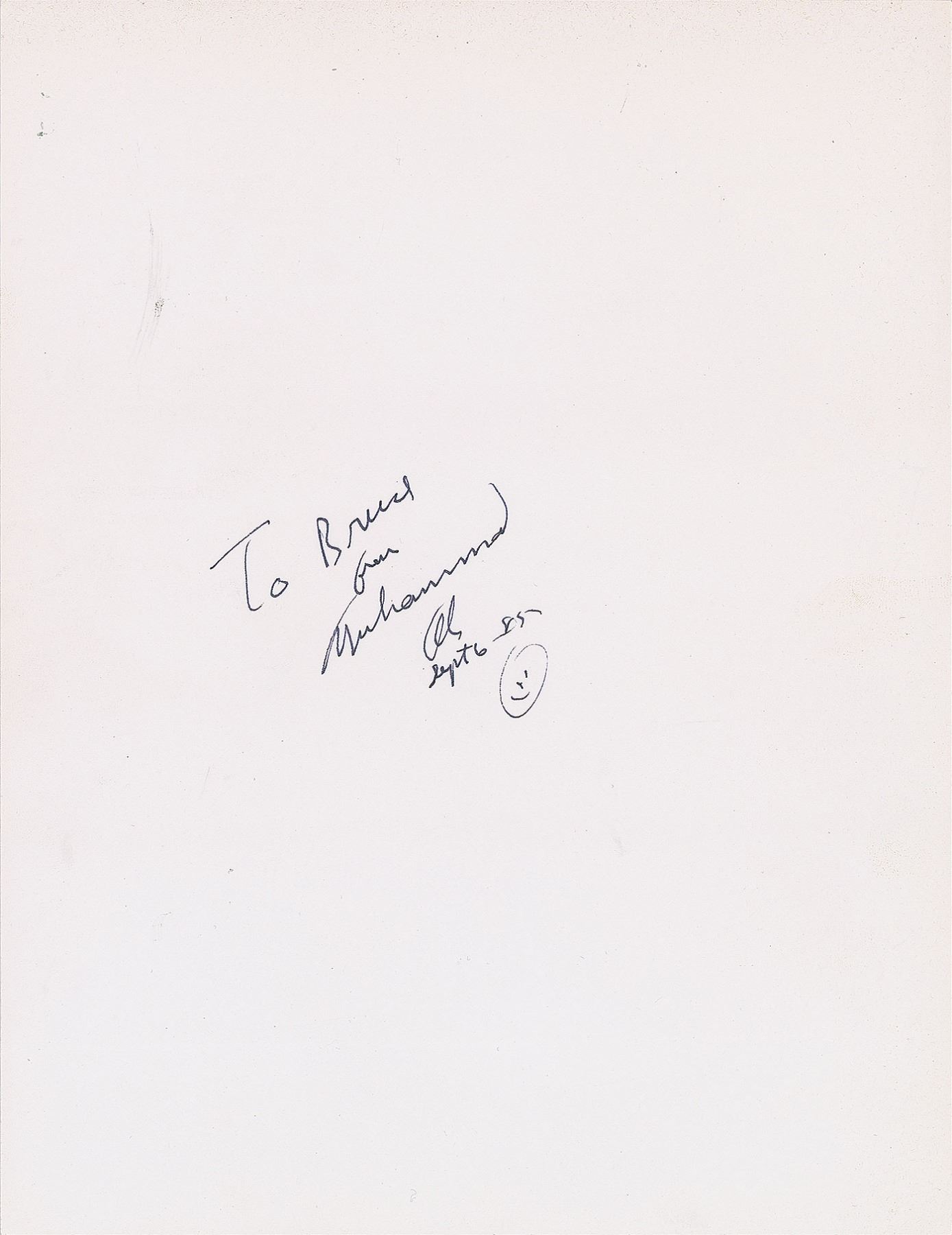 Felt tip signature and inscription, "To Bruce, from Muhammad Ali, Sept. 6-85," on an off-white 8.5 x 11 sheet, with a quick smiley face sketch below. In fine condition.