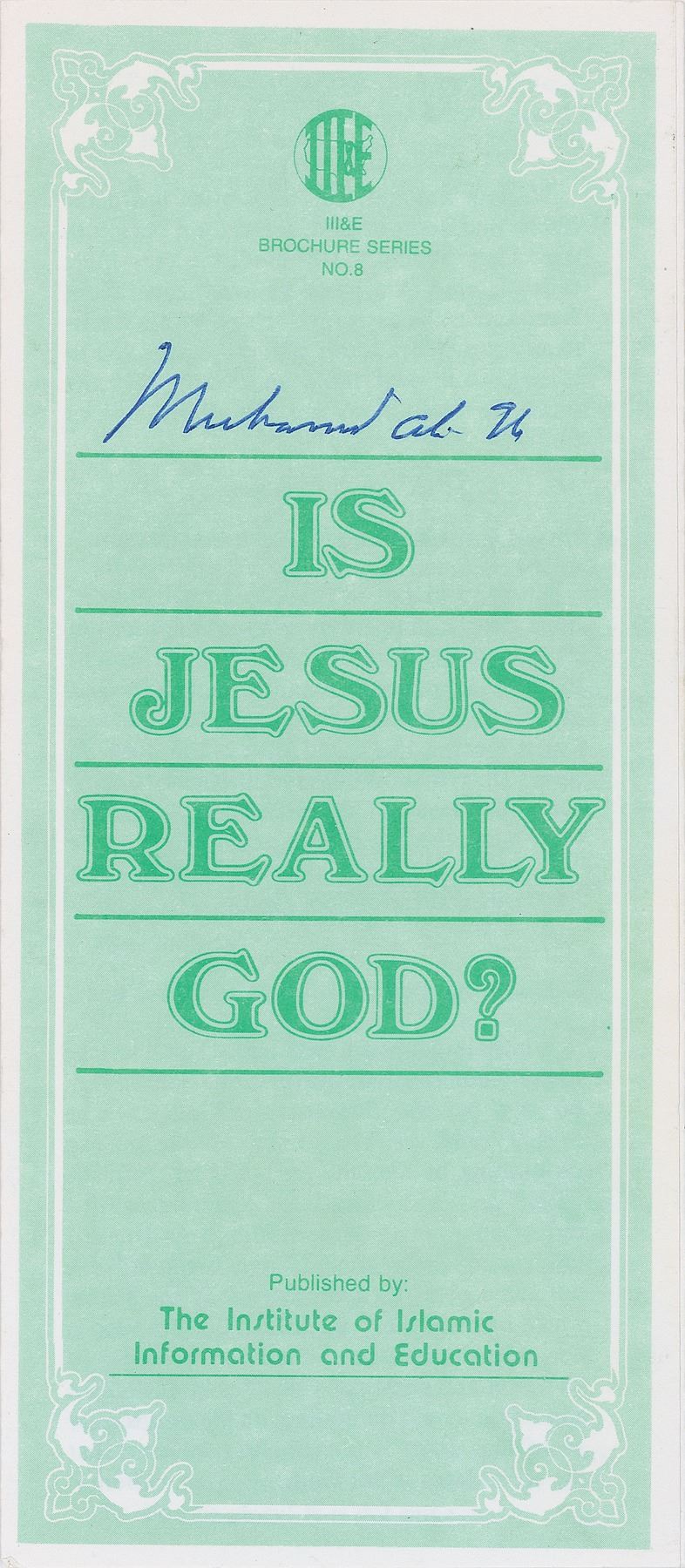 Tri-fold religious pamphlet entitled "Is Jesus Really God?," 3.75 x 8.5, signed on the front in blue ballpoint, "Muhammad Ali 96." In fine condition.