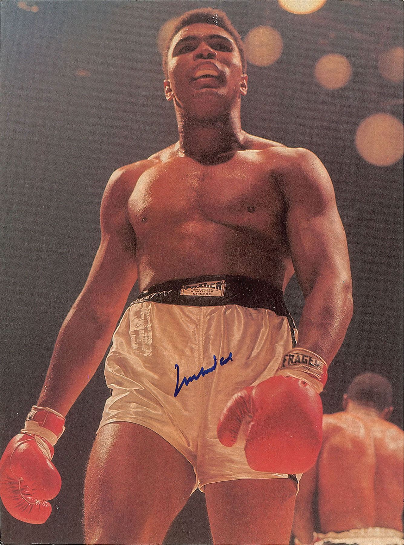 Color semi-glossy 8.25 x 11 magazine photo of Ali in an imposing three-quarter-length pose as he returns to his corner during a boxing match, signed over his trunks in blue felt tip. In fine condition. Accompanied by a full letter of authenticity from PSA/DNA.