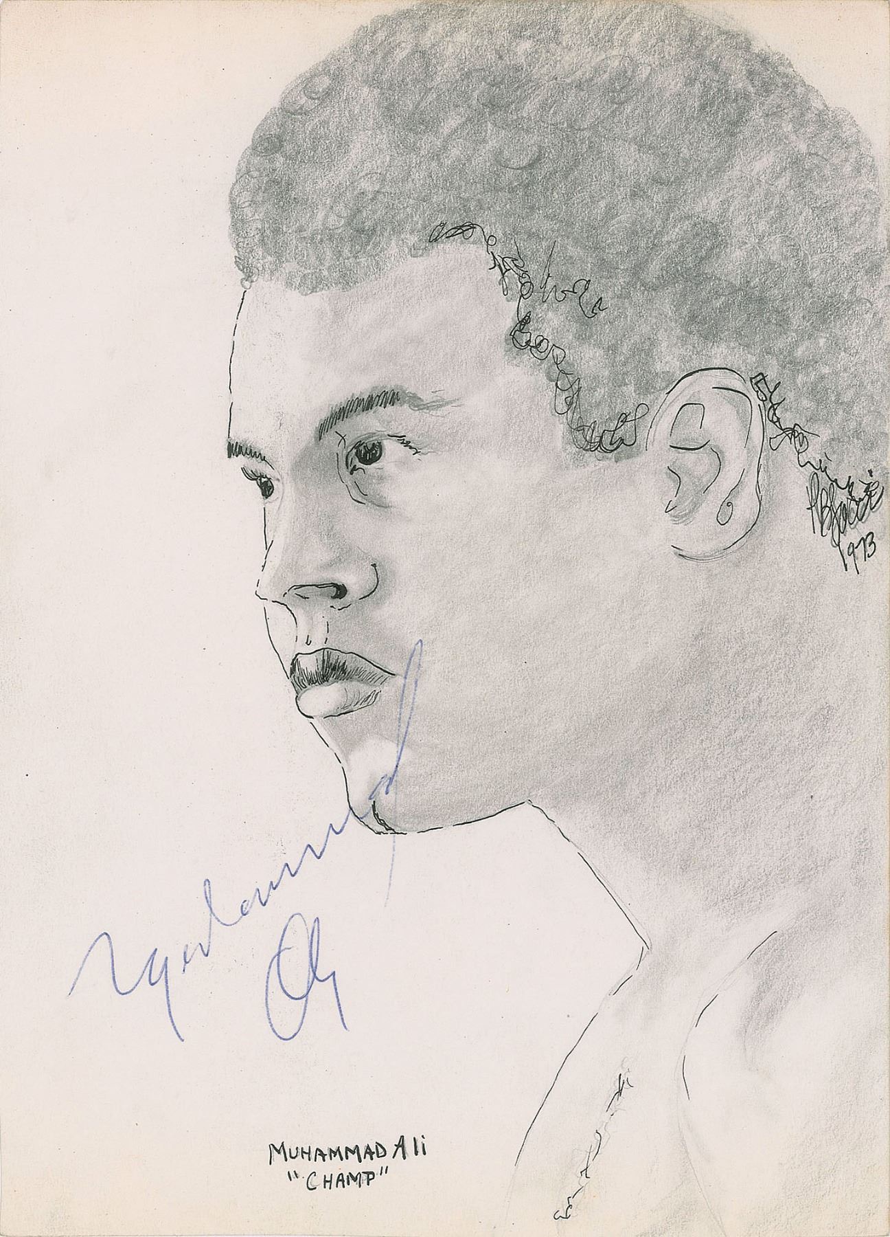 Ballpoint signature, "Muhammad Ali,” on an off-white 7.5 x 10.5 sheet bearing a sketch of Ali in a profile pose, accomplished in ink and graphite by one of his talented fans. In fine condition.
