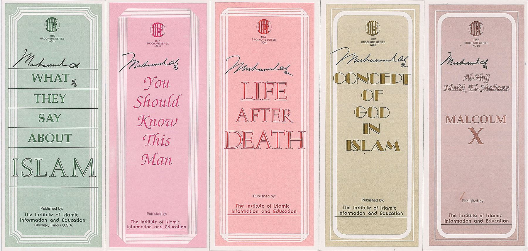 Group of five religious pamphlets, each signed on the front cover in black felt tip or ballpoint by Muhammad Ali. Titles include: "Malcolm X," "What They Say About Islam," "You Should Know This Man," "Life After Death," and "Concept of God in Islam." In overall very fine condition.