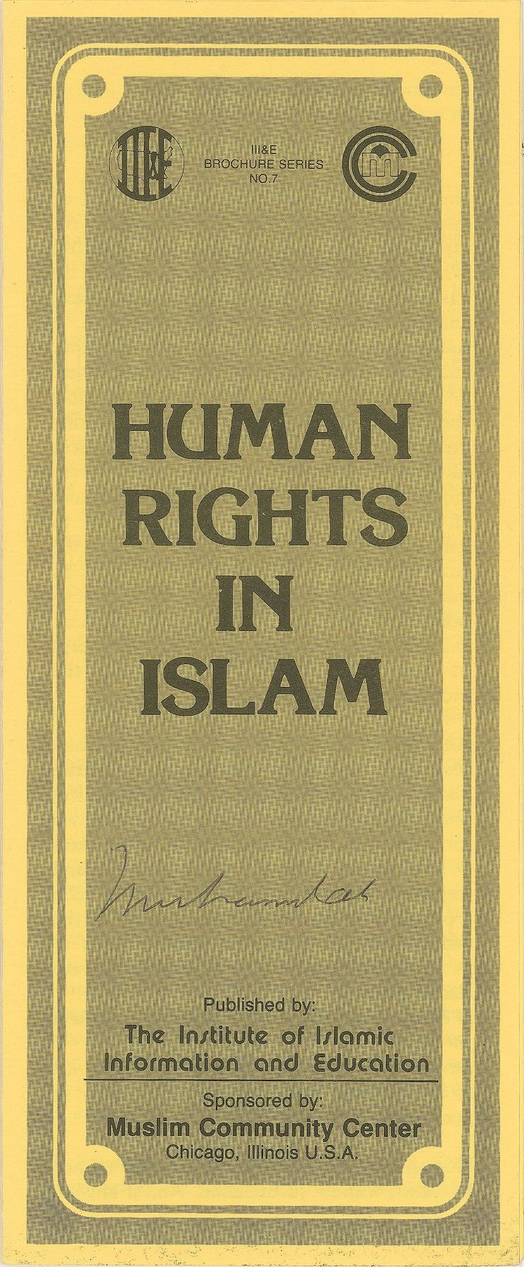 Folding religious brochure entitled "Human Rights in Islam" published by The Institute of Islamic Information and Education in Chicago, 3.5 x 8.5, signed on the front in black ballpoint by Muhammad Ali. In very fine condition.