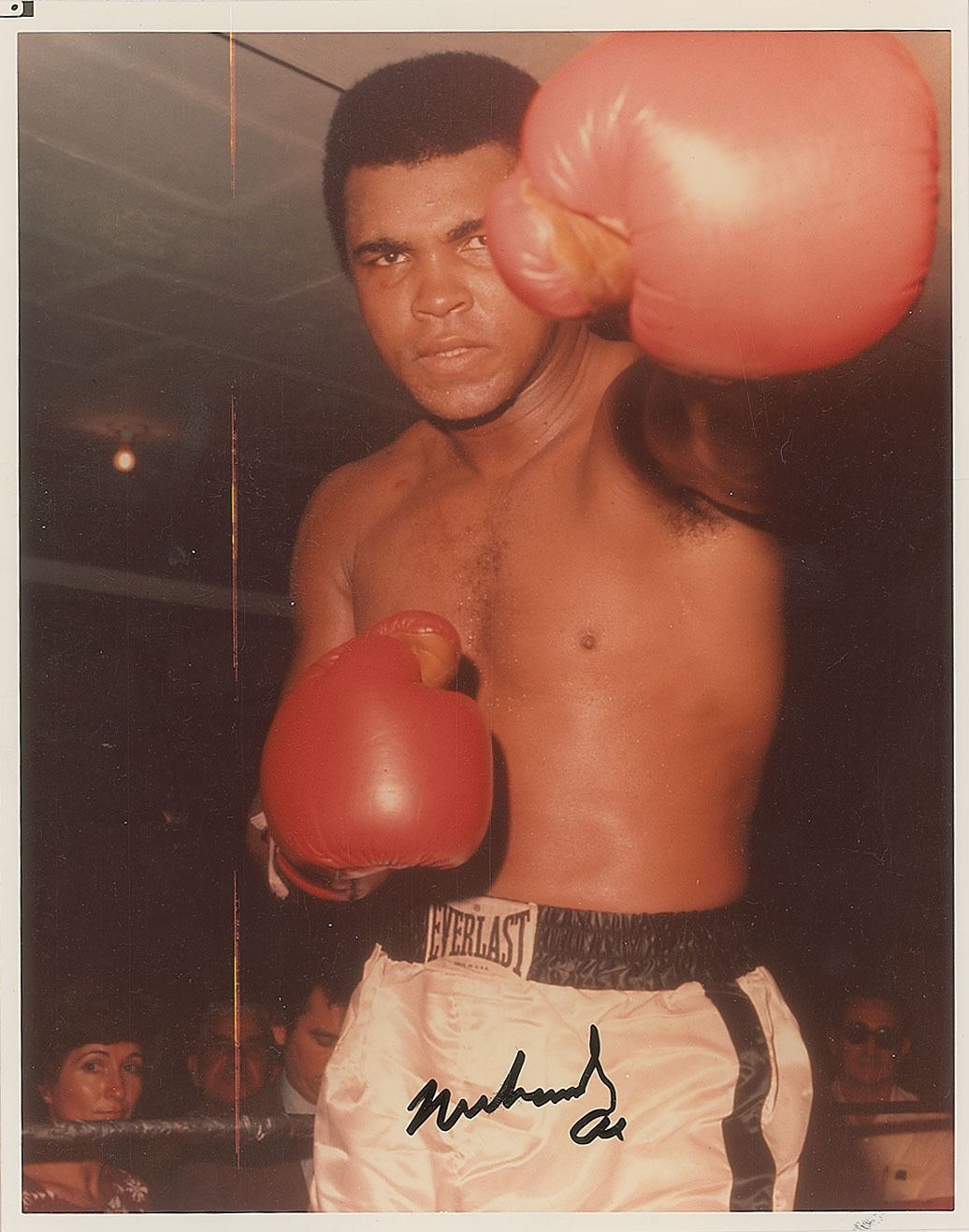 Color glossy 8 x 10 photo of Muhammad Ali placing his glove close to the camera during a training session, signed in black felt tip. In very good to fine condition, with a thin vertical scratch running just to the left of Ali.
