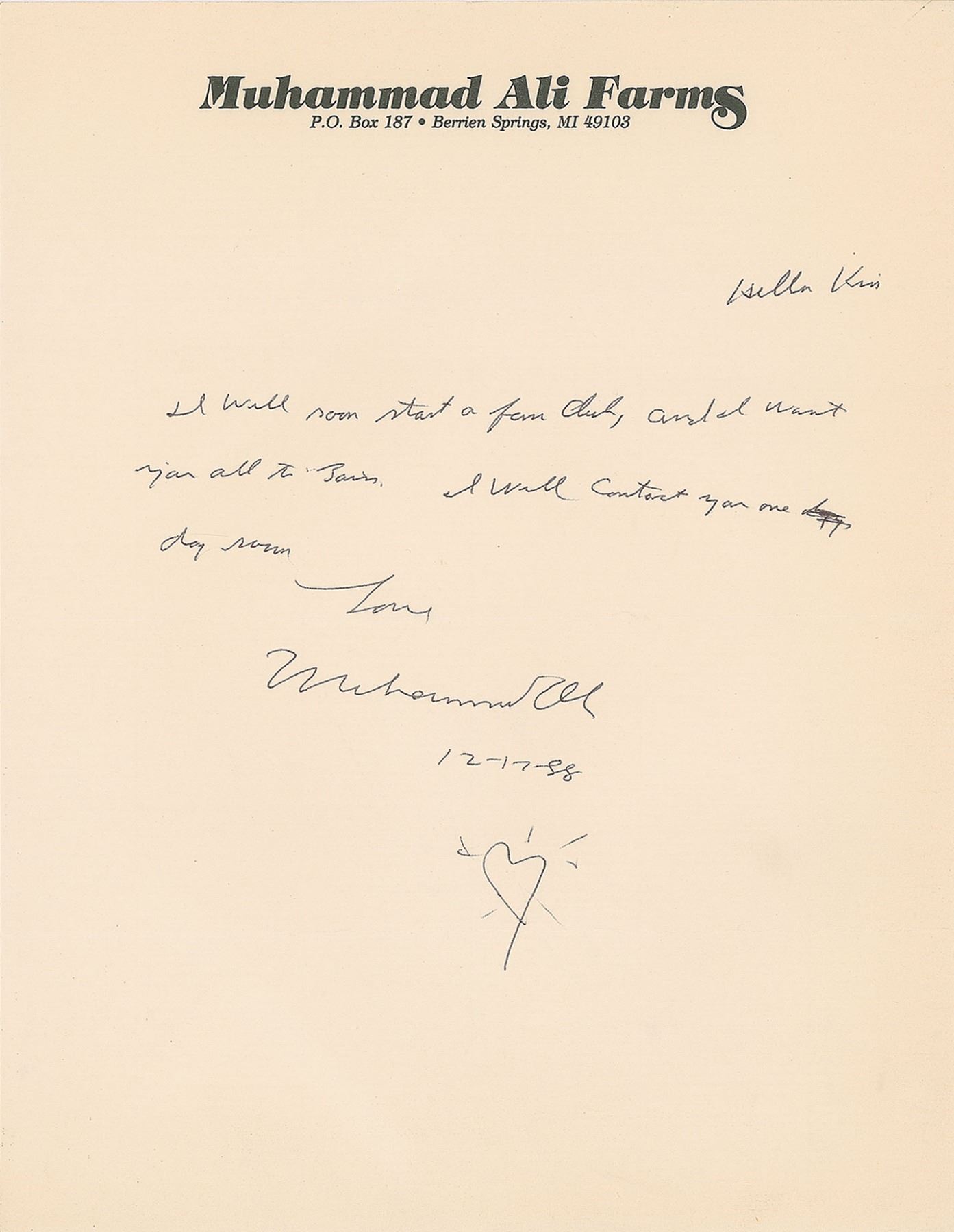 ALS, one page, 8.5 x 11, Muhammad Ali Farms letterhead, December 17, 1988. In full: "I will soon start a fan club, and I want you all to join. I will contact one day soon." Ali signs at the conclusion and adds a heart with the date. In fine condition.