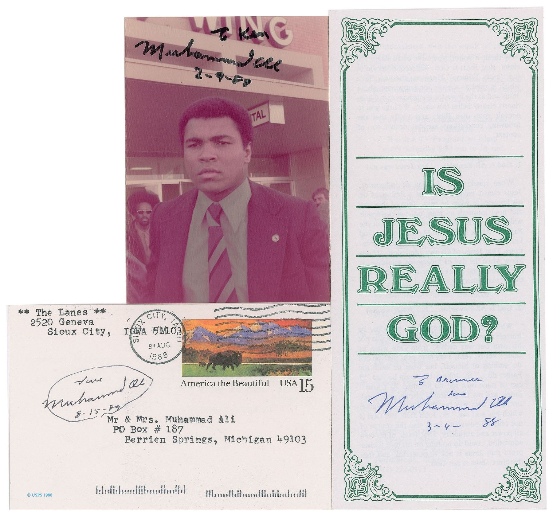 Three items: a color satin-finish 3.5 x 5 candid photo of Ali in a suit and tie, signed and inscribed in black felt tip, "To Ken, Muhammad Ali, 2–9–88"; a tri-fold religious pamphlet entitled "Is Jesus Really God?," 3.75 x 8.5, signed and inscribed on the front in black ballpoint, "To the Brownes, love, Muhammad Ali, 3–4–88"; and a black ballpoint signature, "Thank you, Muhammad Ali, 8–6–89," with heart sketch at the bottom of a typed fan letter, 5.5 x 3.5, dated August 9, 1989. The reverse is also signed, "Love, Muhammad Ali, 8–15–89." In overall fine condition. Accompanied by two original mailing envelopes, both of which are addressed in Ali's own hand.