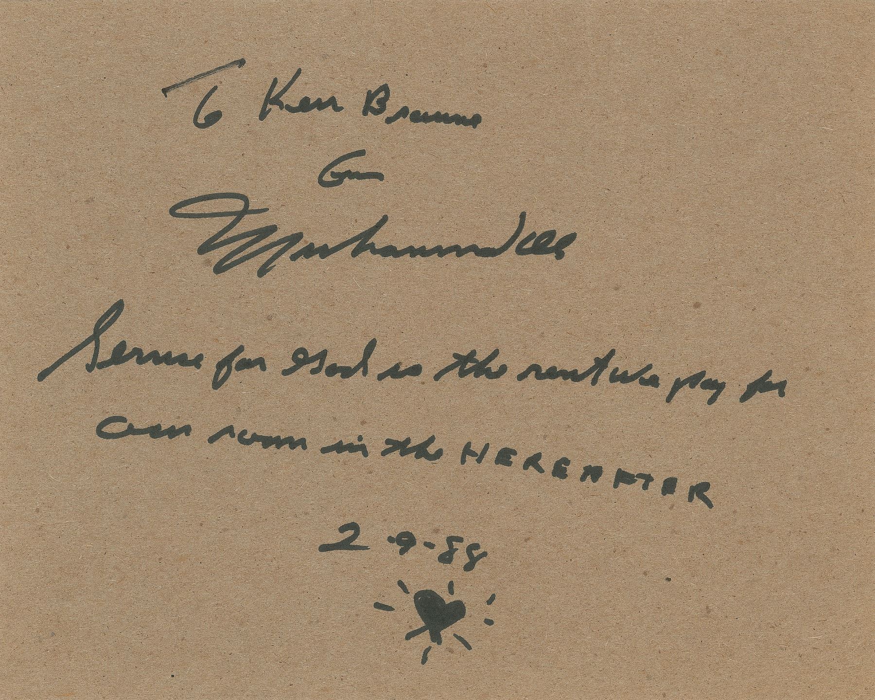 AQS penned in black felt tip on a brown 10 x 8 cardstock sheet, "Service for God is the rent we pay for our room in the Hereafter, 2–9–88," with Ali adding an inscription above, "To Ken Browne, from, Muhammad Ali." In very fine condition.