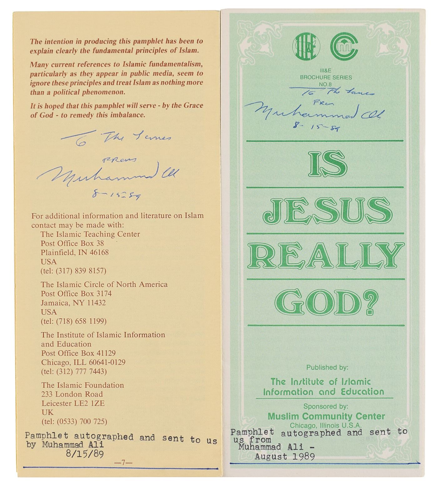 A pair of tri-fold religious pamphlets, entitled "Is Jesus Really God?" and "Islam Explained," both 3.75 x 8.5, one signed and inscribed on the front in ballpoint, "To the Lanes, from, Muhammad Ali, 8–15–89," and the other on the reverse in the same manner. In overall fine condition.