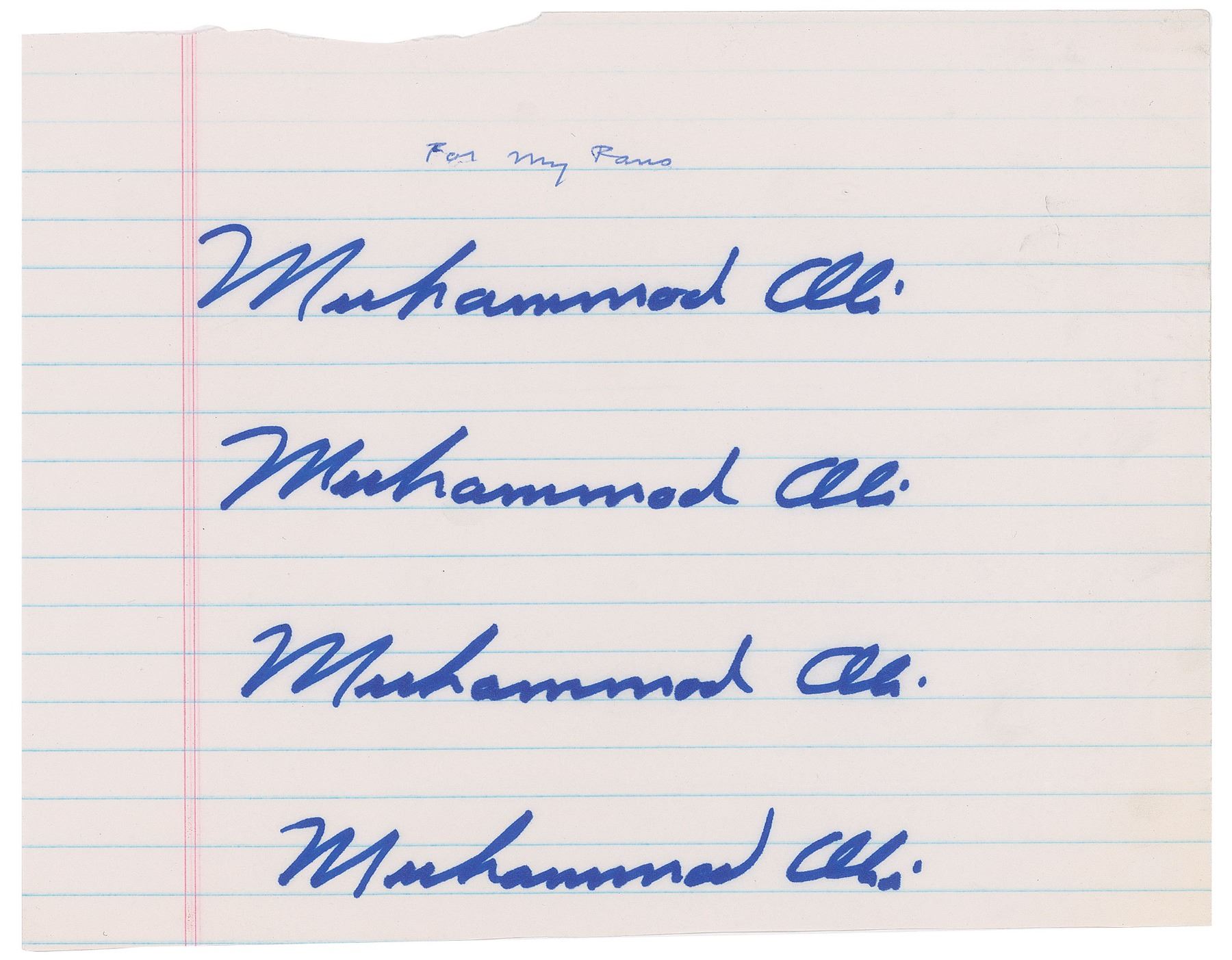 Off-white 8.5 x 6.5 notebook sheet bearing four blue felt tip signatures of Muhammad Ali, who adds an inscription in blue ballpoint above, "For my fans." In fine condition.