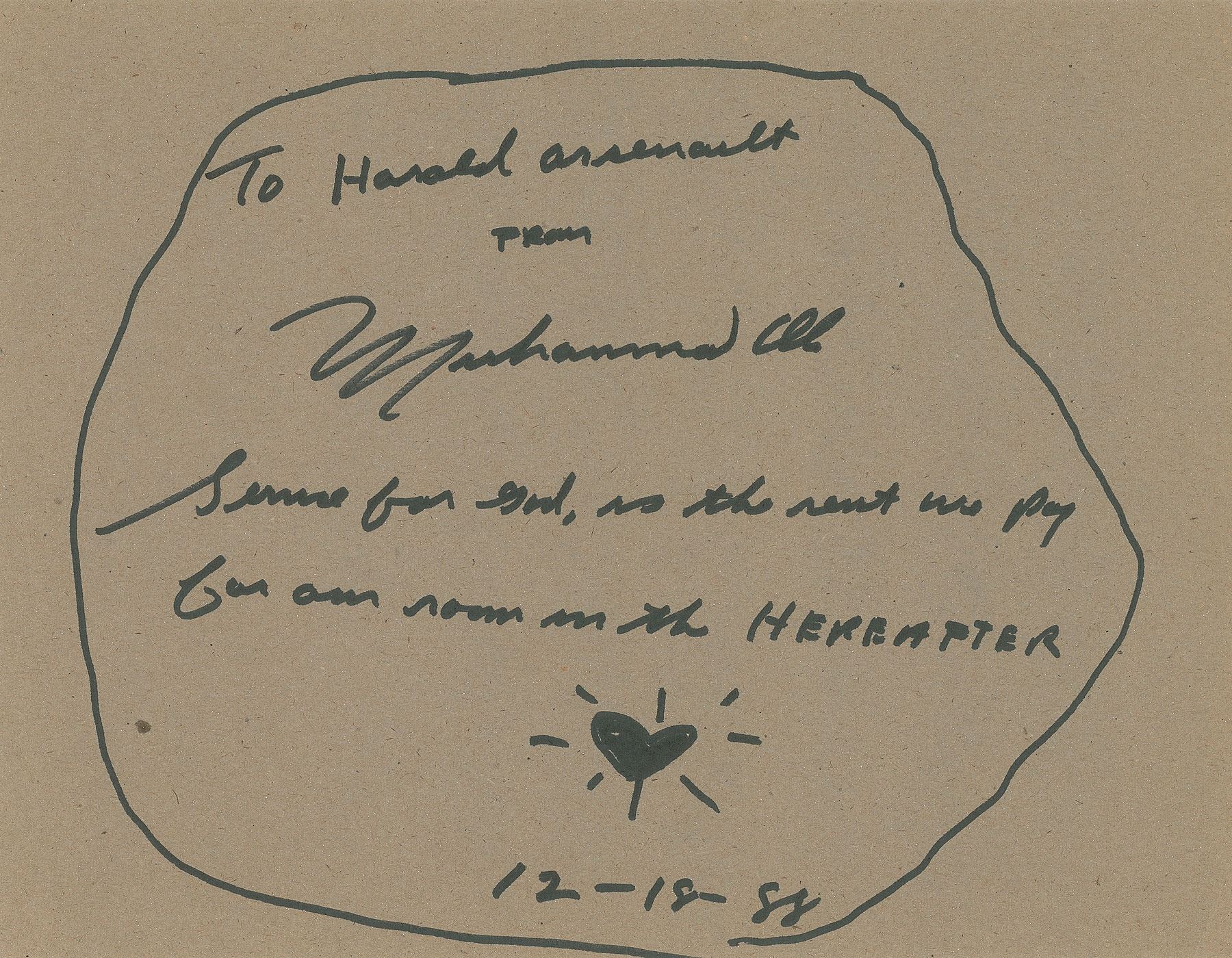 AQS penned in black felt tip on a brown 11 x 8.5 cardstock sheet, "Service for God, is the rent we pay for our room in the Hereafter,12–18–88," with Ali adding an inscription above, "To Harold Arsenault, from, Muhammad Ali." In very fine condition.
