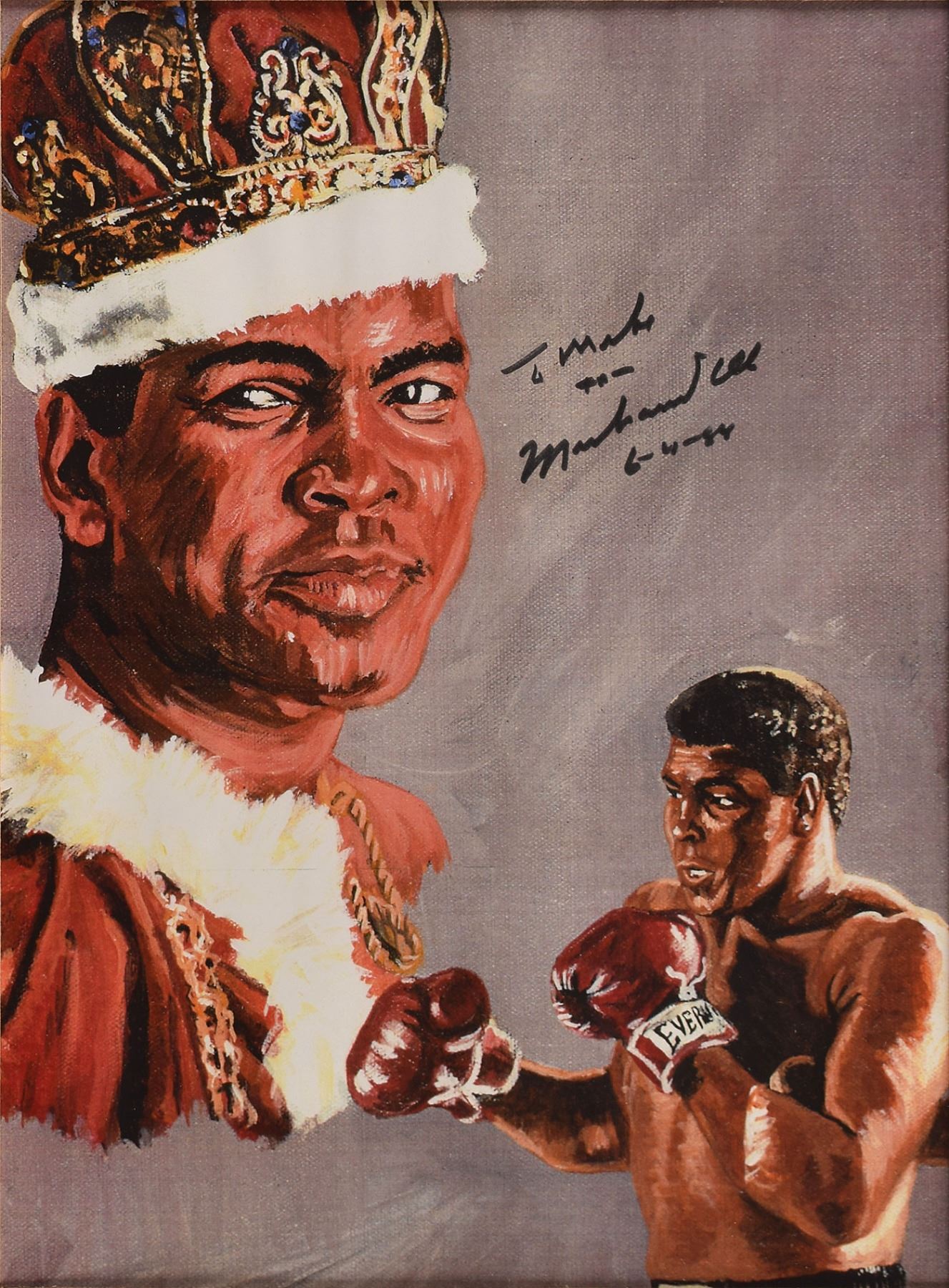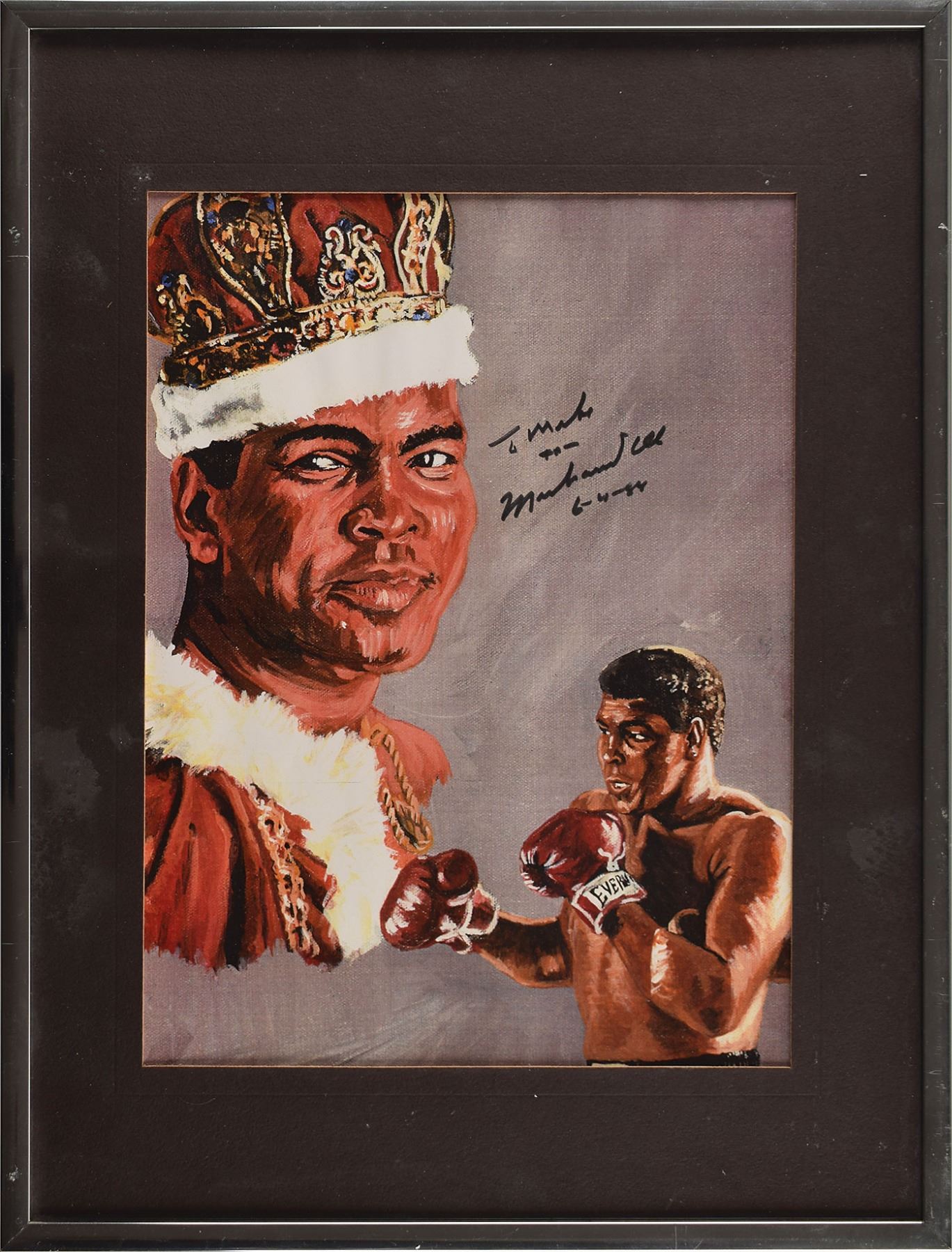 Textured color 8.25 x 11.25 print depicting Ali as boxing's king, signed and inscribed in black felt tip, "To Mike, from Muhammad Ali,6-4-88." Matted and framed to an overall size of 12.5 x 16.5. In fine condition.