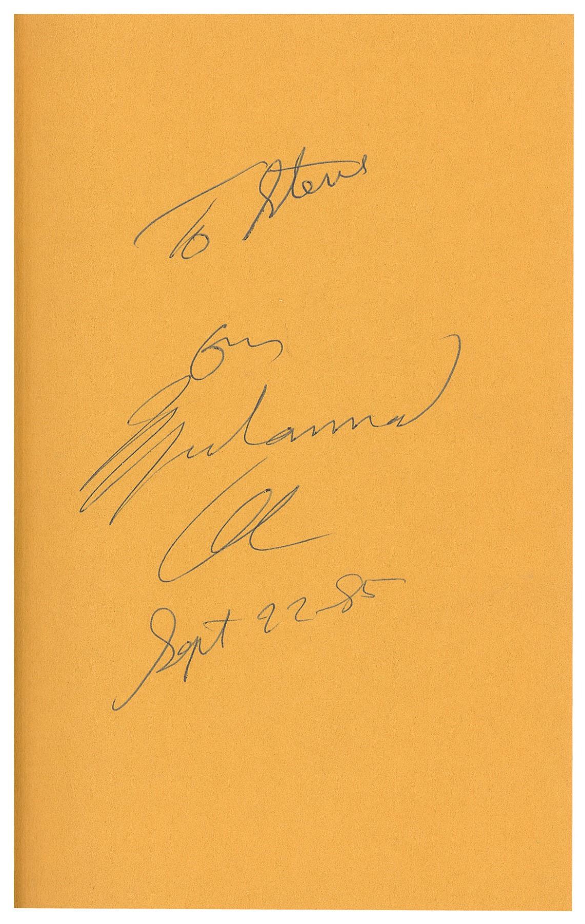 Signed book: Prayer and Al–Islam. Chicago, Illinois: Muhammad Islamic Foundation, 1982. Hardcover, 5.5 x 8.75, 297 pages. Signed and inscribed on the first free end page in black ballpoint, "To Steve, from Muhammad Ali, Sept. 22–85." In fine condition, with bumps to the upper corners of the covers.