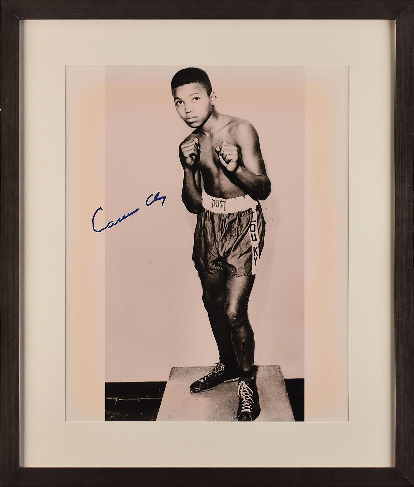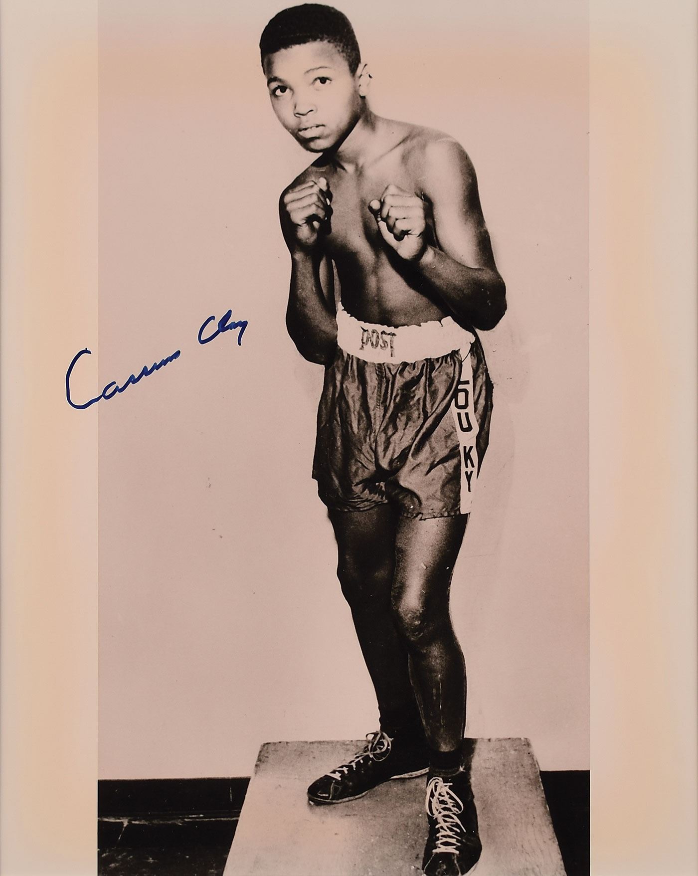 Glossy 15.5 x 19.5 photo of the very young Ali in his boxing trunks with his fists up, signed in blue felt tip, "Cassius Clay." Matted and framed to an overall size of 22.5 x 26.5. In fine condition.