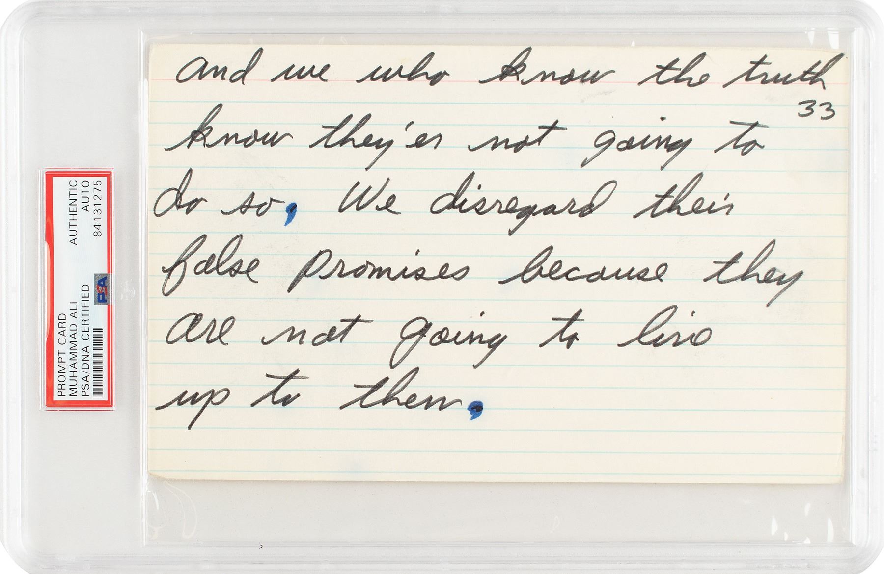 Unsigned handwritten note by Muhammad Ali on an oversized 8 x 5 card, no date. Apparently a prompt card for a speech, in full: "And we who know the truth know they're not going to do so. We disregard their false promises because they are not going to live up to them." In fine condition. Encapsulated by PSA/DNA.