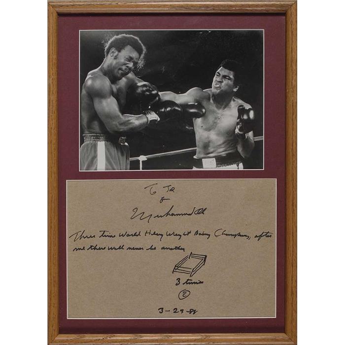 AQS on a 10 x 7 piece of light brown cardboard. Ali writes, “Three Time World Heavyweight Champion, after me there will never be another.” Ali signs and inscribes at the top, “To Joe from Muhammad Ali,” and under his quote adds a small sketch of a boxing ring, adding “three times & 3-29-88.” Matted and framed with a photo of Ali decking George Foreman, to an overall size of 12.5 x 17. In fine condition. Pre-certified Steve Grad/PSA/DNA and RRAuction COA.