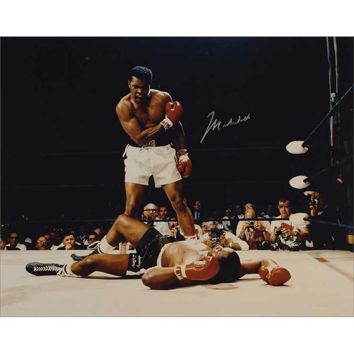 Classic color glossy 20 x 16 photo of Ali standing over a fallen Sonny Liston, signed in silver ink. In very fine condition. Pre-certified Steve Grad/PSA/DNA and RRAuction COA.