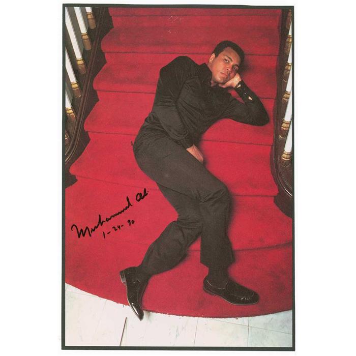 Color 7.5 x 11 cardstock photo of Ali reclining on a flight of red-carpeted stairs, signed in black felt tip, “Muhammad Ali 1-24-90.” In fine condition, with a few light surface dings near top edge. Pre-certified Steve Grad/PSA/DNA and RRAuction COA.