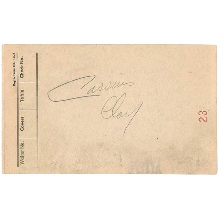 Vintage pencil signature, “Cassius Clay,” on an off-white 6 x 3.75 restaurant order check. In fine condition, with even overall toning, and some scattered light soiling from carbon underneath, which bears a carbon of the signature. Pre-certified Steve Grad/PSA/DNA and RRAuction COA.