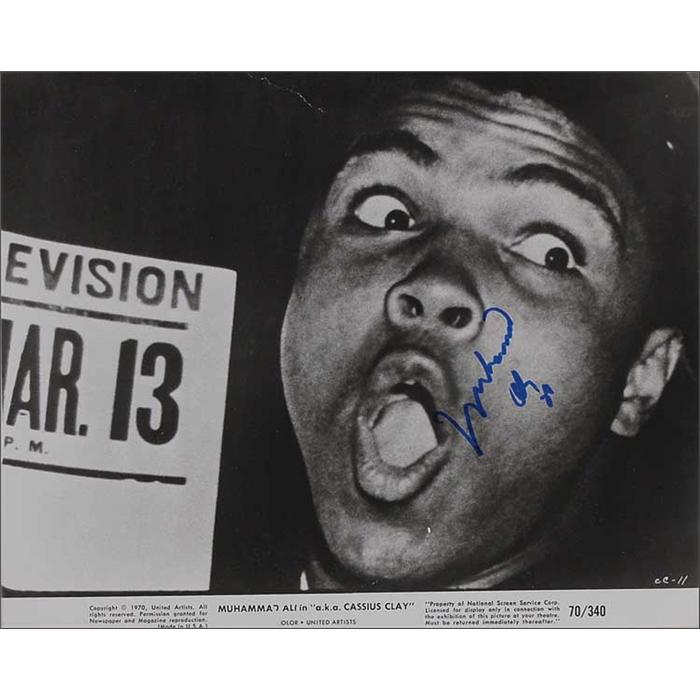 Glossy 10 x 8 United Artists promotional photo for “aka Cassius Clay,” signed in blue felt tip, “Muhammad Ali ‘89.” Double matted to an overall size of 14 x 11. In very good condition, with several noticeable creases. Pre-certified Steve Grad/PSA/DNA and RRAuction COA.