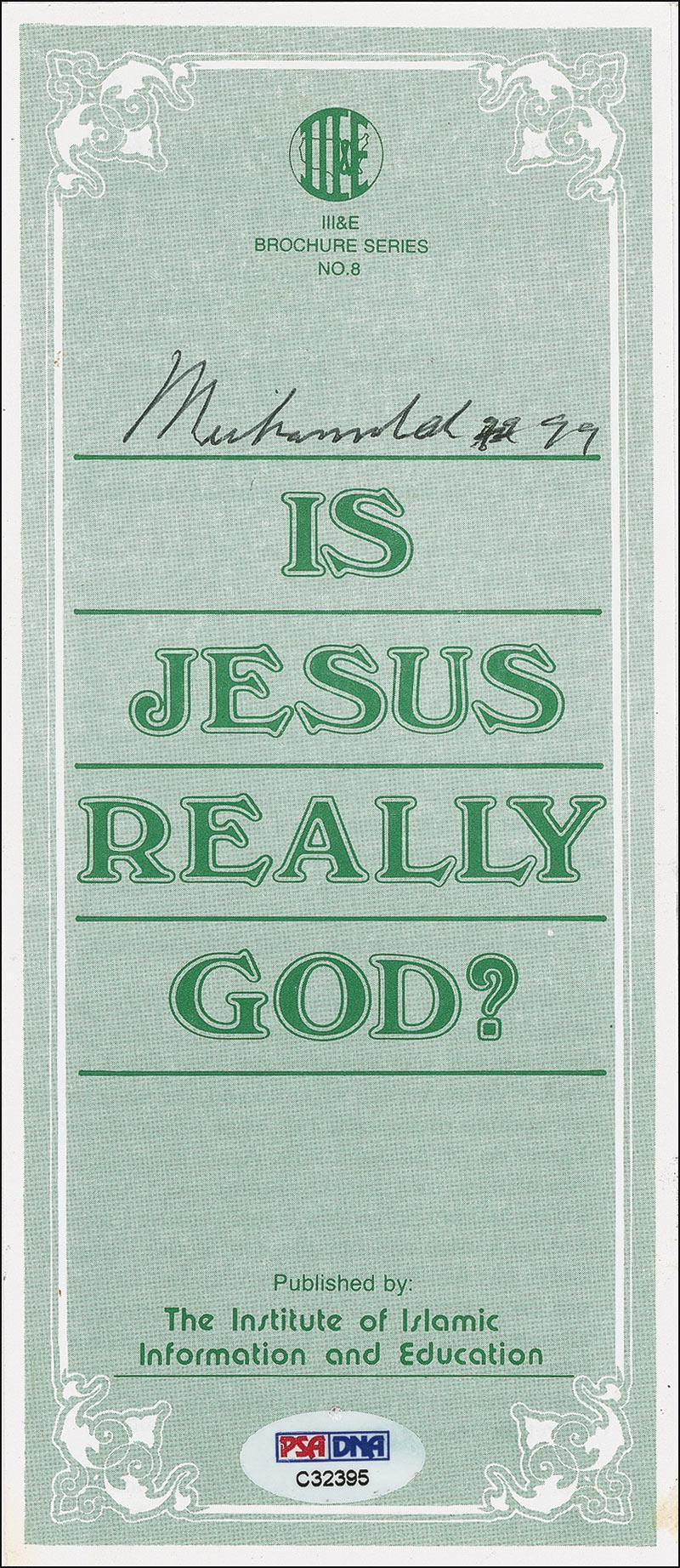 Tri-fold Islamic religious pamphlet, 3.75 x 8.5, signed on the front in black ink by Ali. In fine condition, with a PSA/DNA authentication label affixed to bottom of front. RRAuction COA.