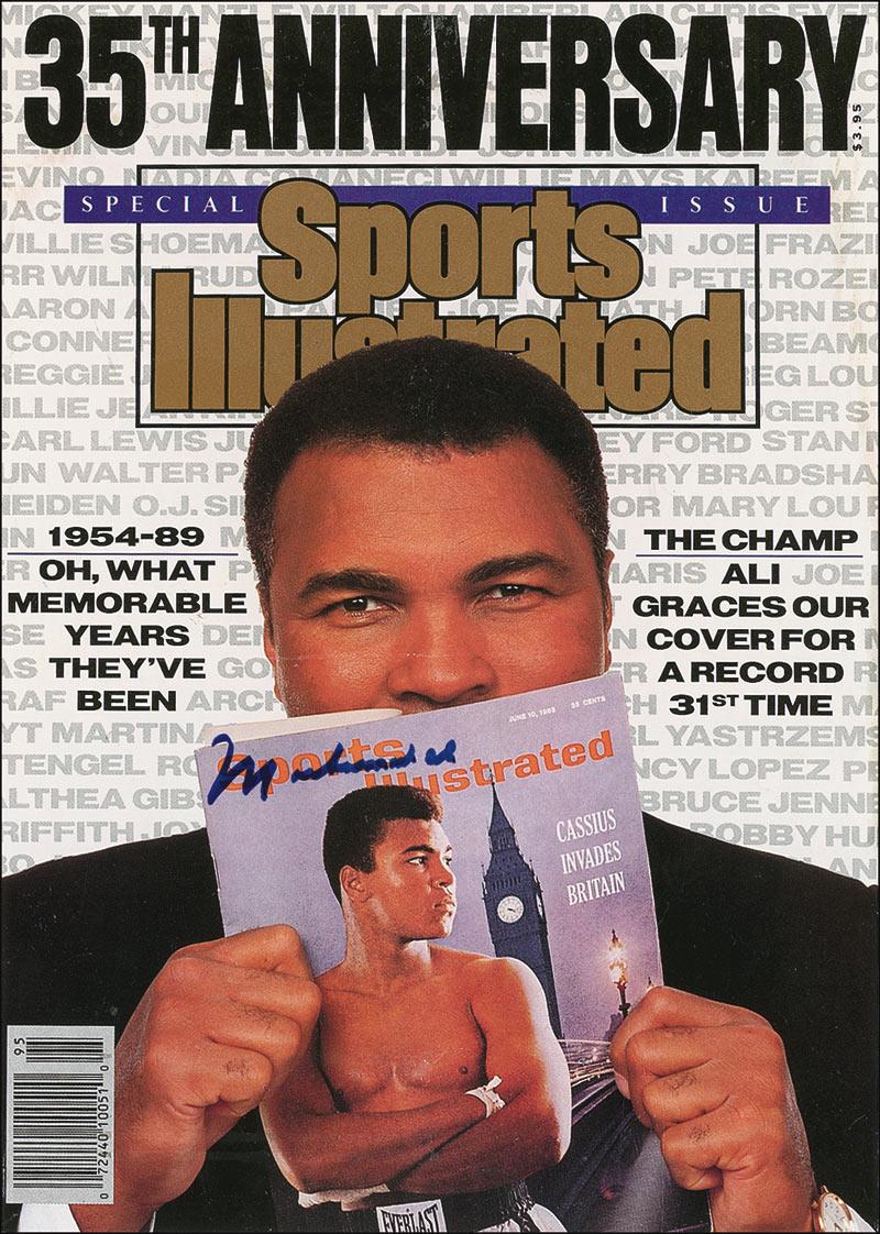 Magazine cover from the 35th Anniversary issue of Sports Illustrated, 7.75 x 11, featuring Ali on the front cover for a record-breaking 31st time, signed in blue felt tip. Cover is affixed to an identical size sheet of heavier cardstock. In fine condition, with light adhesive remnants from mailing label.