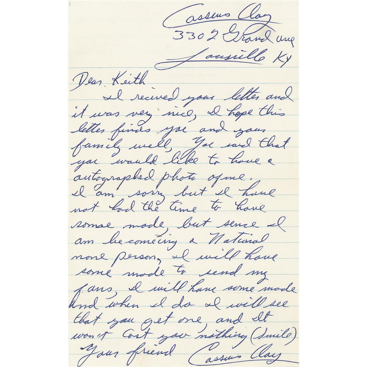 This rare piece of handwritten correspondence was sent just as Muhammad Ali (nee Cassius Clay) was beginning his ascent to boxing glory. Although he was a highly successful amateur boxer, finishing with a record of 100-5, Clay did not become a household name until he won the light heavyweight gold medal at the 1960 Olympics in Rome. Still technically a teenager when he sent this letter, the 19-year-old Clay had been featured in a Sports Illustrated article that same week and had just punished his opponent, Alex Miteff, on his road to becoming heavyweight champion of the world. That brutal assault came on the heals of a fight three months earlier against Alonzo Johnson, where some analysts criticized his performance. He was determined to show improvement against Miteff...and he did. Even at that tender age, he also proved that he was as quick with his gloves as he was with his mouth, already establishing an 8–0 record. A rare early letter from the dawn of one of the most remarkable careers in boxing history.
