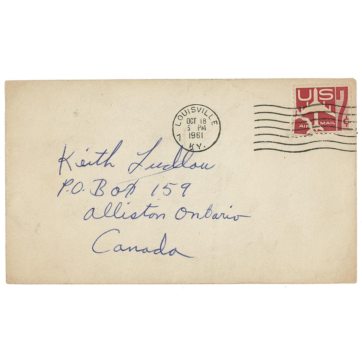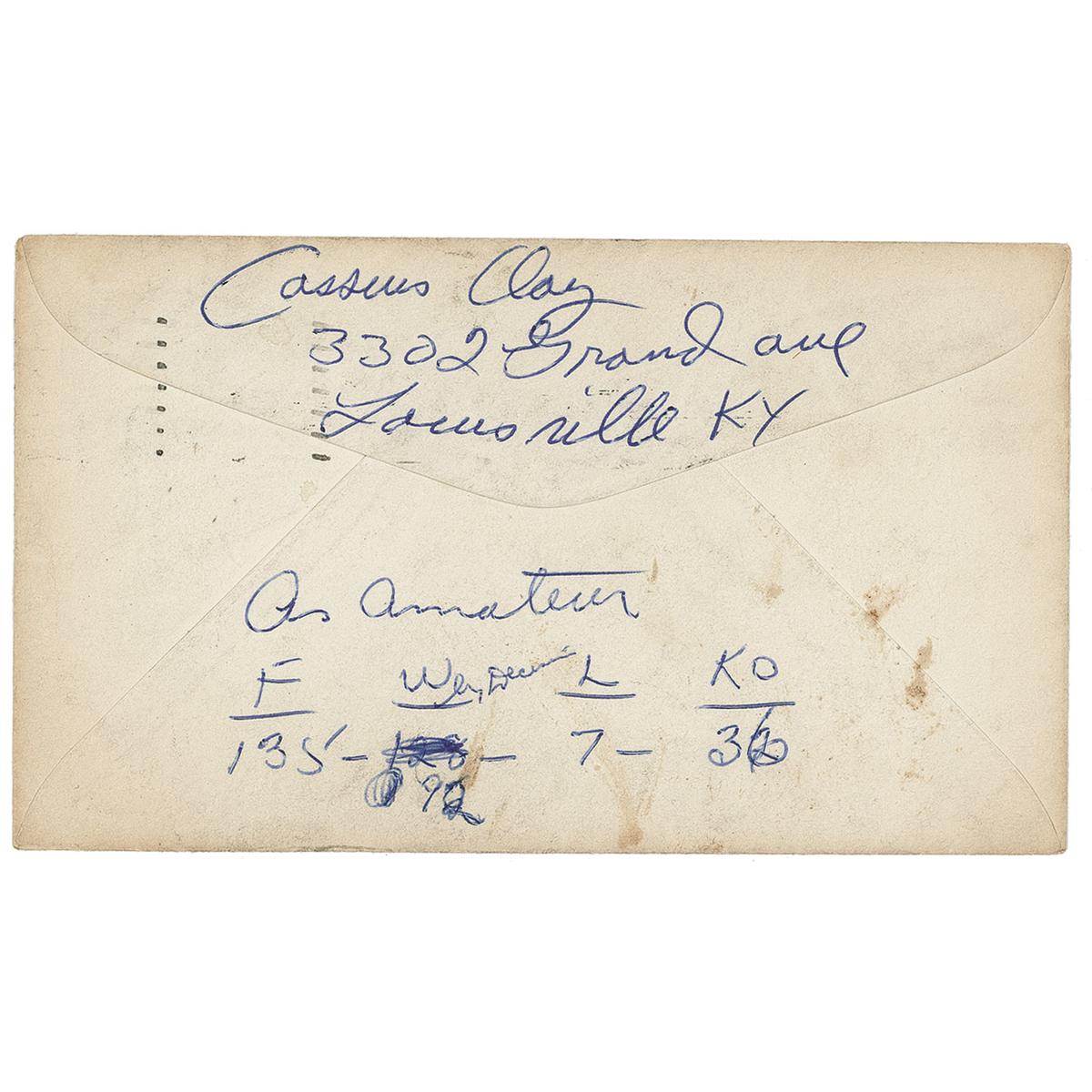 ALS signed “Your friend, Cassius Clay,” one page, lightly-lined, 5 x 8, accompanied by its mailing envelope postmarked Louisville, Kentucky, October 18, 1961. Clay writes to a fan in his first year as a professional boxer. In full: “I received your letter and it was very nice, I hope this letter finds you and your family well, you said that you would like to have a autographed photo of me. I am sorry but I have not had the time to have some made, but since I am becoming a National none [sic] person, I will have some made to send to my fans, I will have some made and when I do I will see that you get one, and it won’t cost you nothing (smile).” Clay adds a second signature at the top of the letter, as well as his Louisville, Kentucky return address. In fine, clean condition. Accompanied by the aforementioned original mailing envelope, addressed in Clay’s hand, and signed again on the reverse “Cassius Clay,” as part of his return address on the back flap. Also on the envelope, in another hand, is Clay’s amateur record.