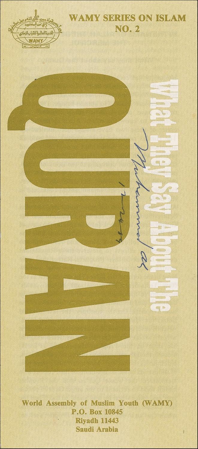 Tri-fold religious pamphlet entitled “What They Say about the Quran,” 3.75 x 8.5, signed vertically in blue ballpoint, “Muhammad Ali, 12-24-89.” In very fine condition.