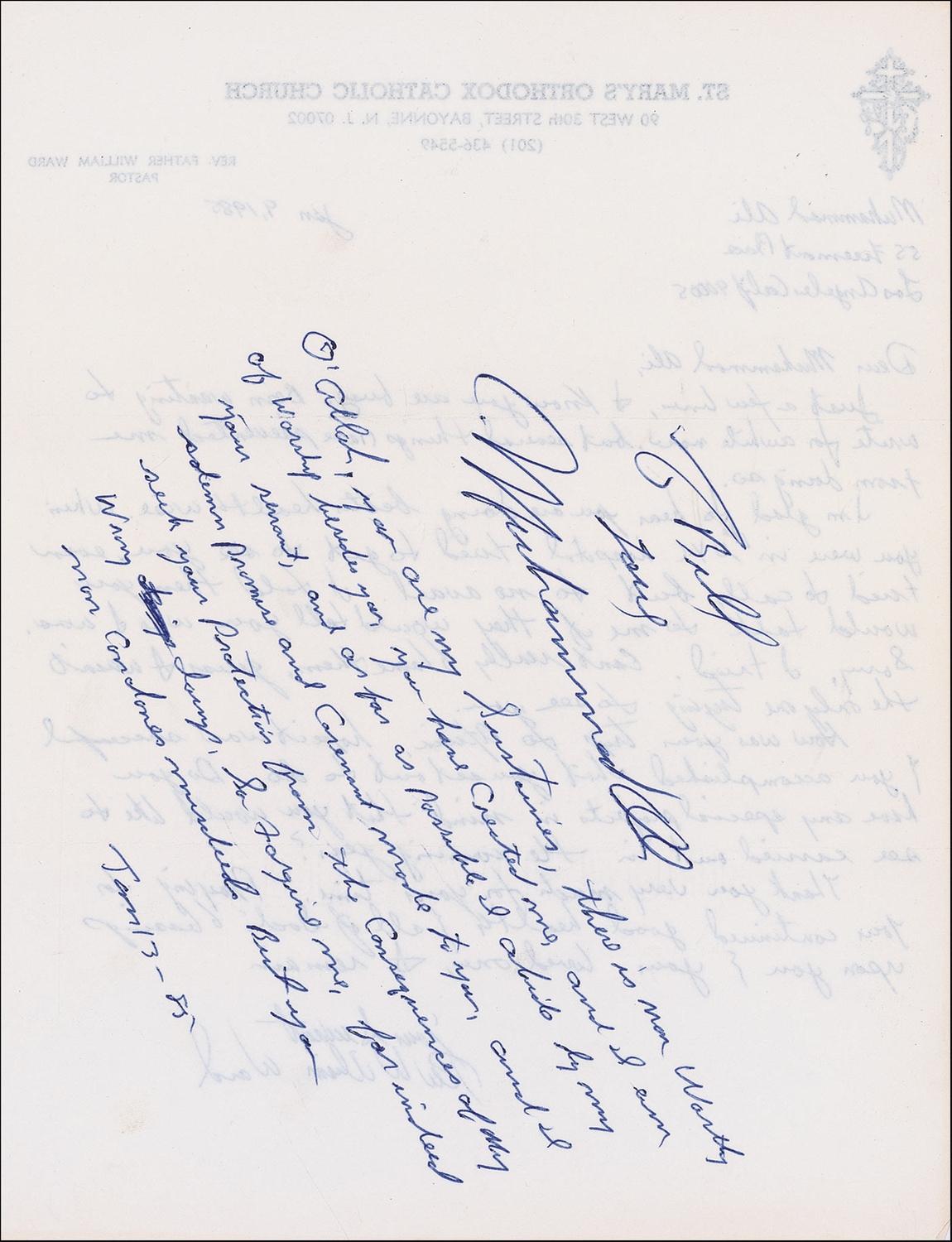 Handwritten prayer on the reverse of a one-page letter to Ali from an admirer, 11 x 8.5. Ali writes: “O’ Allah, you are my Sustainer, there is none worthy of worship besides you, you have created me, and I am your servant, and as far as possible I abide by my solemn promise and Covenant made to you, and I seek your protection from the consequences of my wrong days, so forgive me, for indeed none condones misdeeds but you. Jan 13-85.” Signed and inscribed at the top, “To Bill, Love Muhammad Ali.” In fine condition, with two vertical folds, one through a single letter of signature.