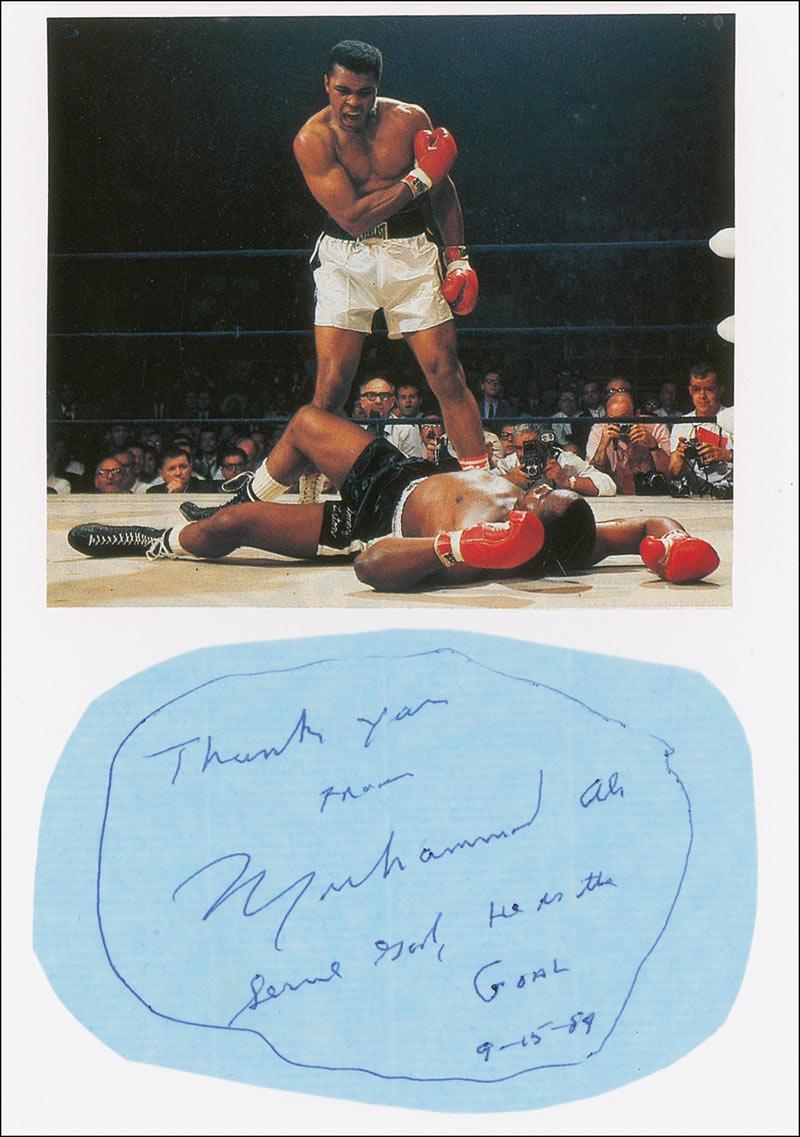 AQS on an oval clipped onionskin page affixed to a 4 x 5.75 card. Ali writes: “Thank you from Muhammad Ali. Serve God, He is the Goal. 9-15-89.” In fine condition.
