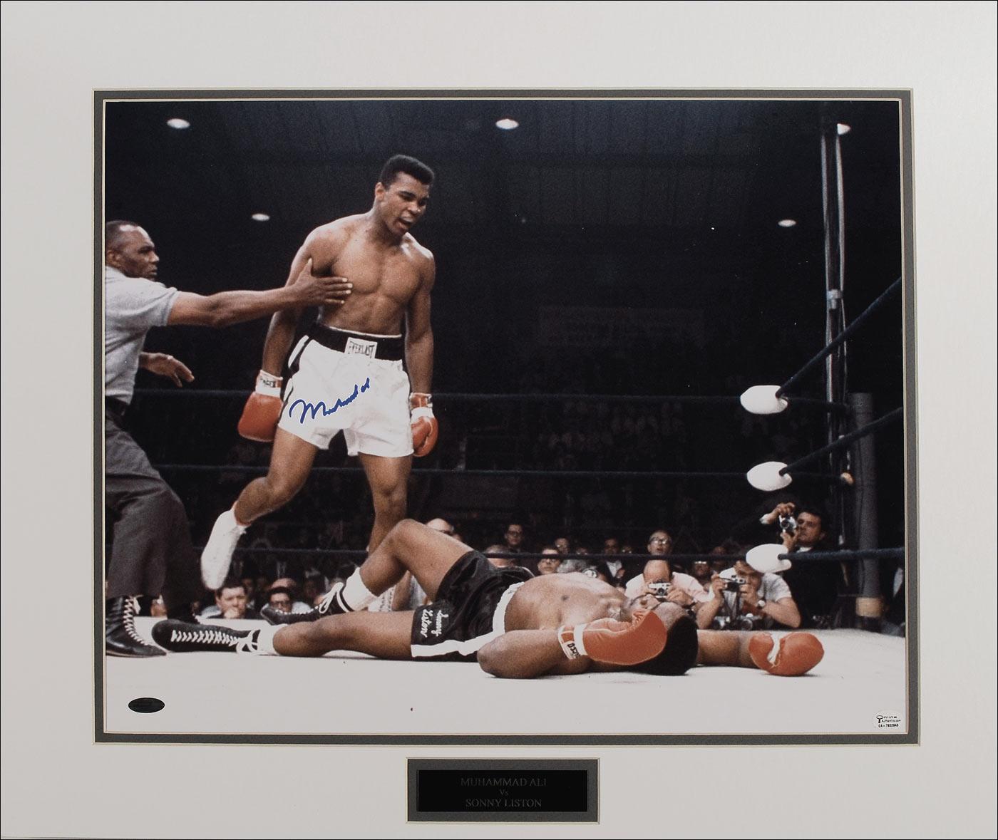Color satin-finish 20 x 16 photo of Ali standing over a down-and-out Sonny Liston, signed in blue felt tip. Double matted to an overall size of 24 x 20. In very fine condition, with a Steiner hologram affixed to lower left; and another authentication label to lower right. Accompanied by a certificate of authenticity from Steiner.