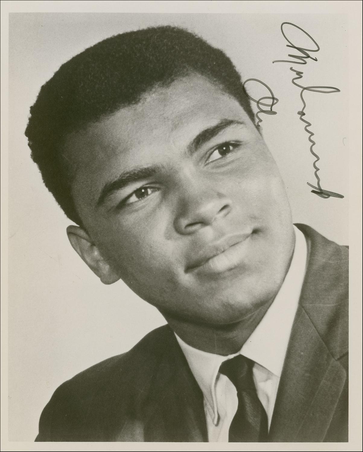 Vintage glossy 8 x 10 portrait of Ali in a suit and tie, signed in fountain pen, “Muhammad Ali.” The image is housed within a 10 x 12 presentation folder entitled, “Muhammad Ali World’s Heavyweight Boxing Champion 1964–19_” and accompanied by an unsigned photo of Ali in a boxing pose. In fine condition; the folder is in very good condition with soiling and many unknown signatures on the front cover.
