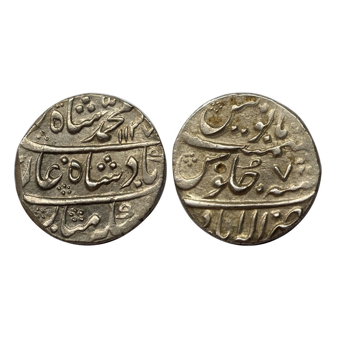 Muhammad Shah, Rupee, Allahabad Mint, complete Mint name in the bottom line on rev, AH 1137, RY 7