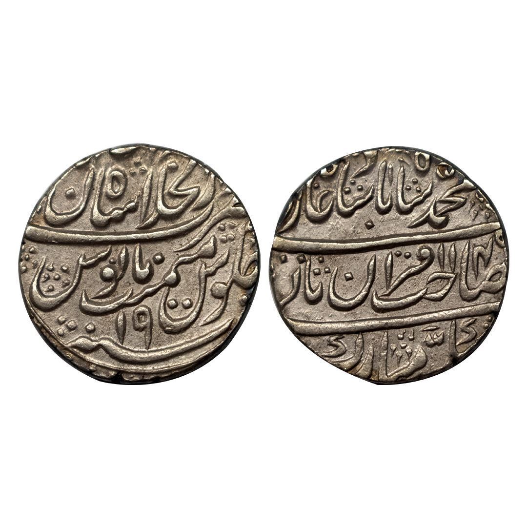 Muhammad Shah, Rupee, Shahjahanabad Dar ul Khilafat Mint, Mint name in the top line on rev, AH 1149, RY 19, Sahib Qiran type. Test Marks, Extremely Fine+.