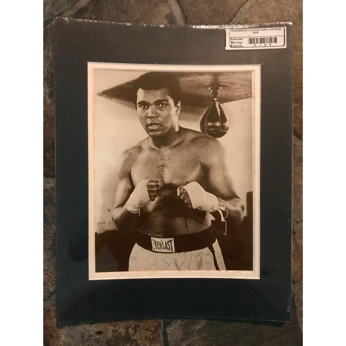 Muhammed Ali boxing celebrity sepia-tone photo print, on heavy card stock, created in the early 1990's for The American Heritage Gallery. Double matted & in original shrink-wrapped packaging. 8" X 10" photo, 11" X 14" mat size overall.Â