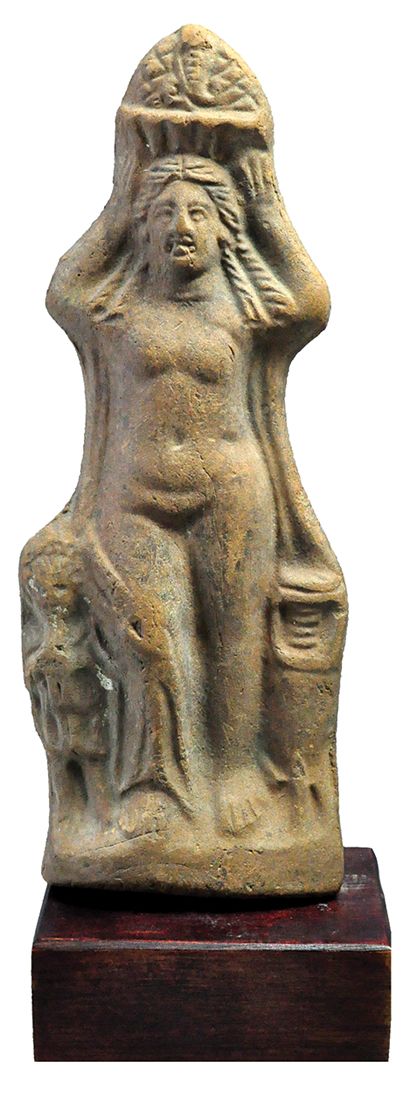 Mujer con cesta (siglos II a.C. - I d.C.). Arcilla roja moldeada en dos piezas. Representa a una mujer frontal, desvestida y de pie, sosteniendo con ambas manos una canasta sobre su cabeza. La cesta a su vez está erigida con una serpiente alada. La figura femenina se encuentra flanqueada por un niño y una ánfora. Altura 18.8 cm. Anchura 7,0 cm. Procedencia: Bonham's, Londres.