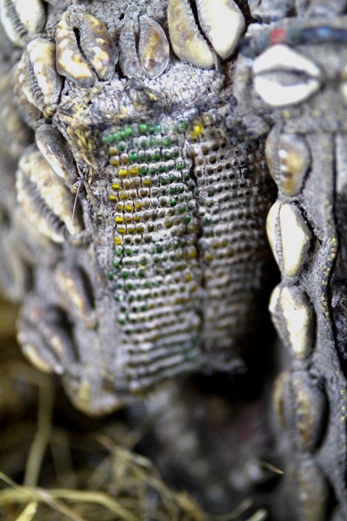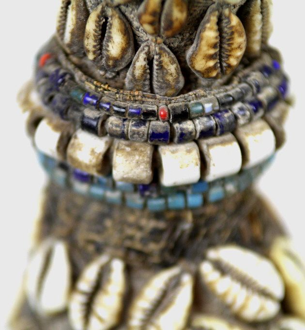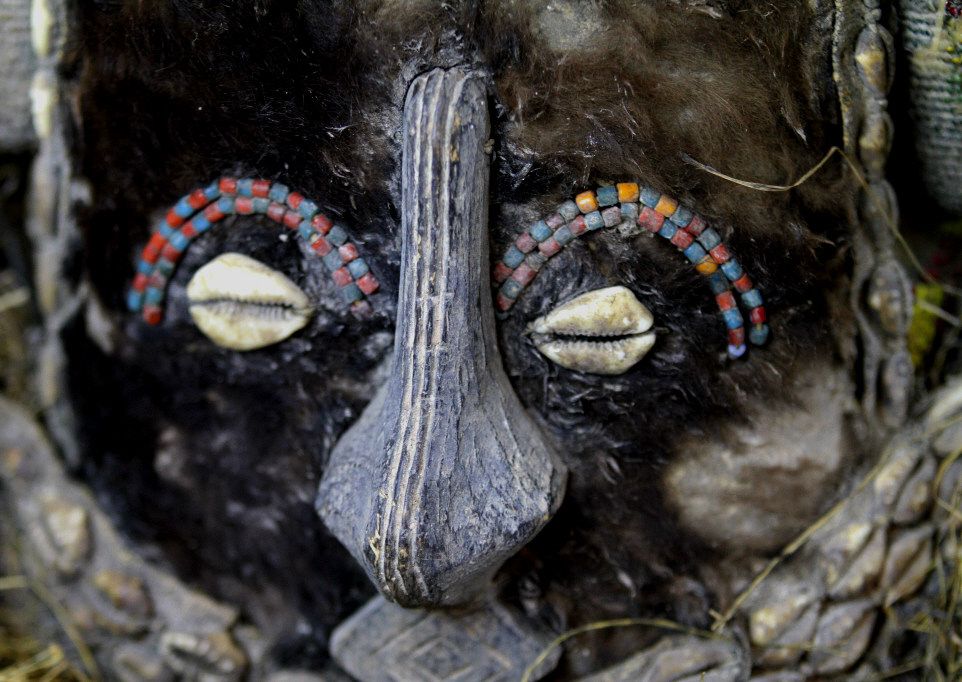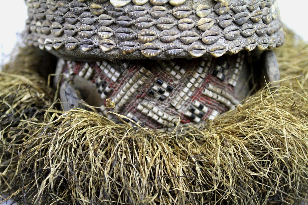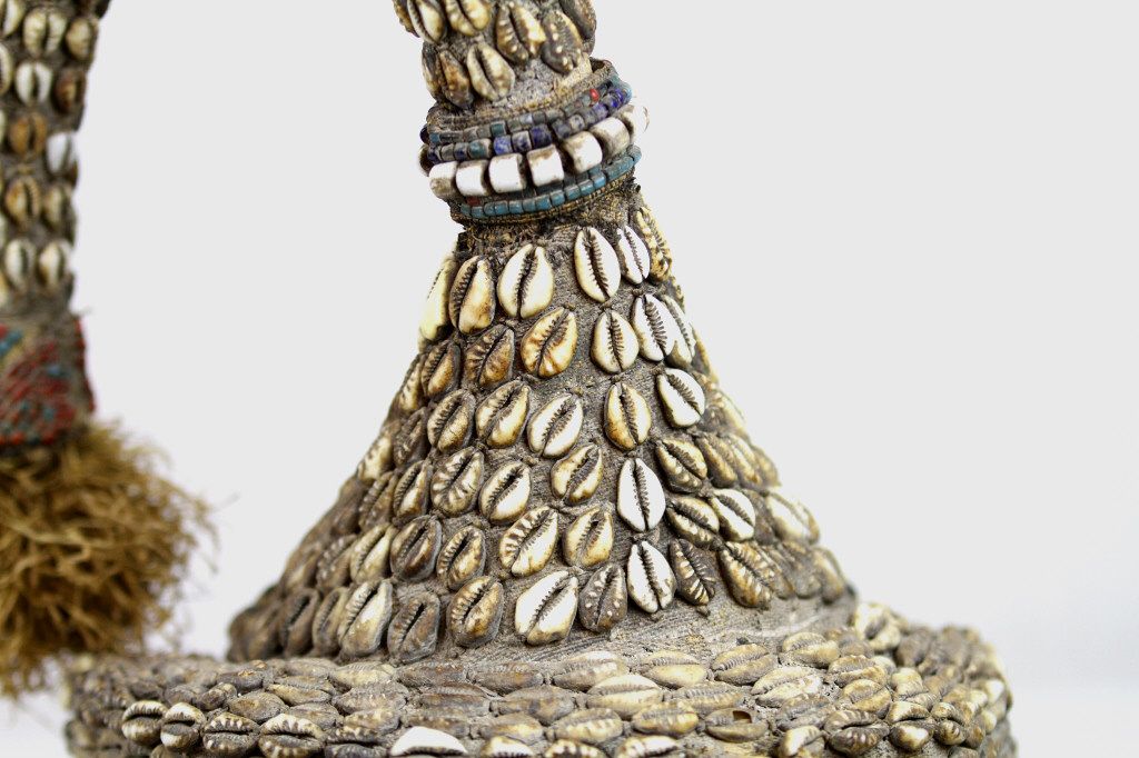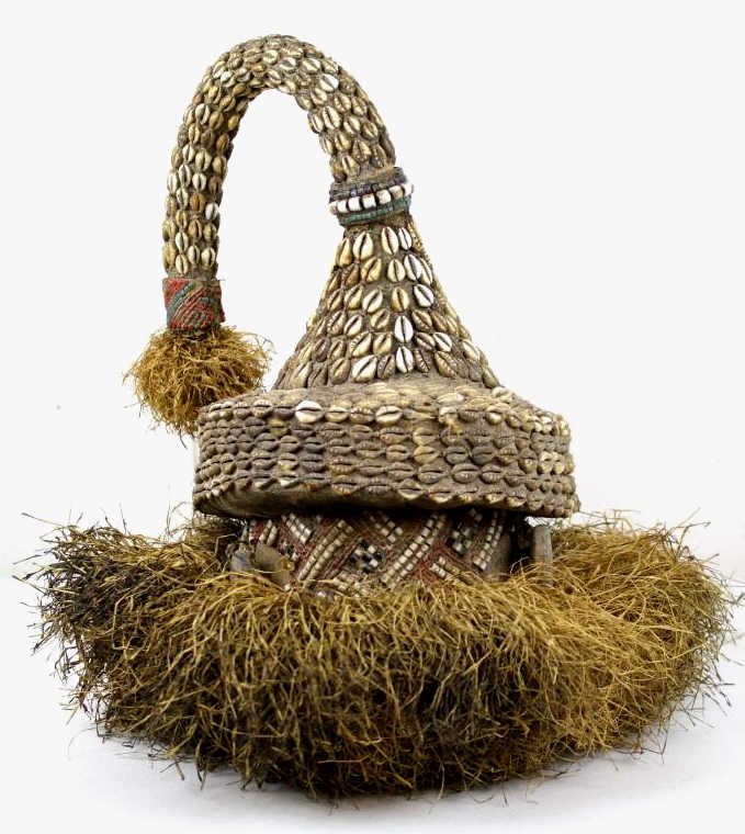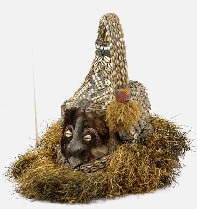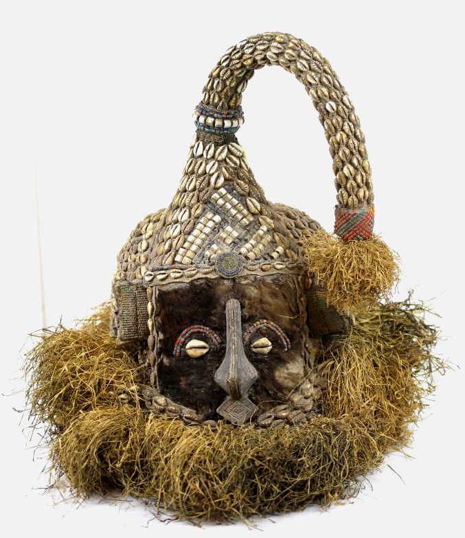 Mukenga Mask 1800's - This mask is from Kuba, Western Kasai region, Democratic Republic of the Congo. This is from the 1800's and is in good condition. This mask would be work by a highly regarded or royal person in the tribe and is a more rare piece. The mask suggest that of an elephant because in their culture it was a mighty supreme symbol of leadership and has special meaning to the Kuba. This piece is hand made on a base of canvas featuring a face covered in fur with a hand carved wood mouth and nose. The mask is covered in shells and beautifully beaded across the entire back of the neck and in other places. The mask also has a grass beard. The craftsmanship on this piece of art is extraordinary. This piece measures 19" high by 20-22" long.