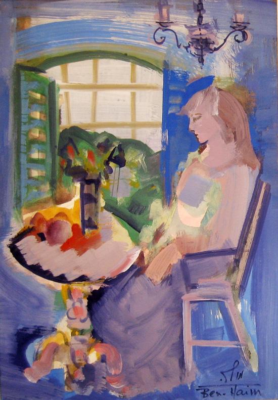 Mula Ben Haim, Israeli Art, 1916 - 1993, Woman near a Table, Gouache, 34x25cm, Signed., , , , Unframed.,
