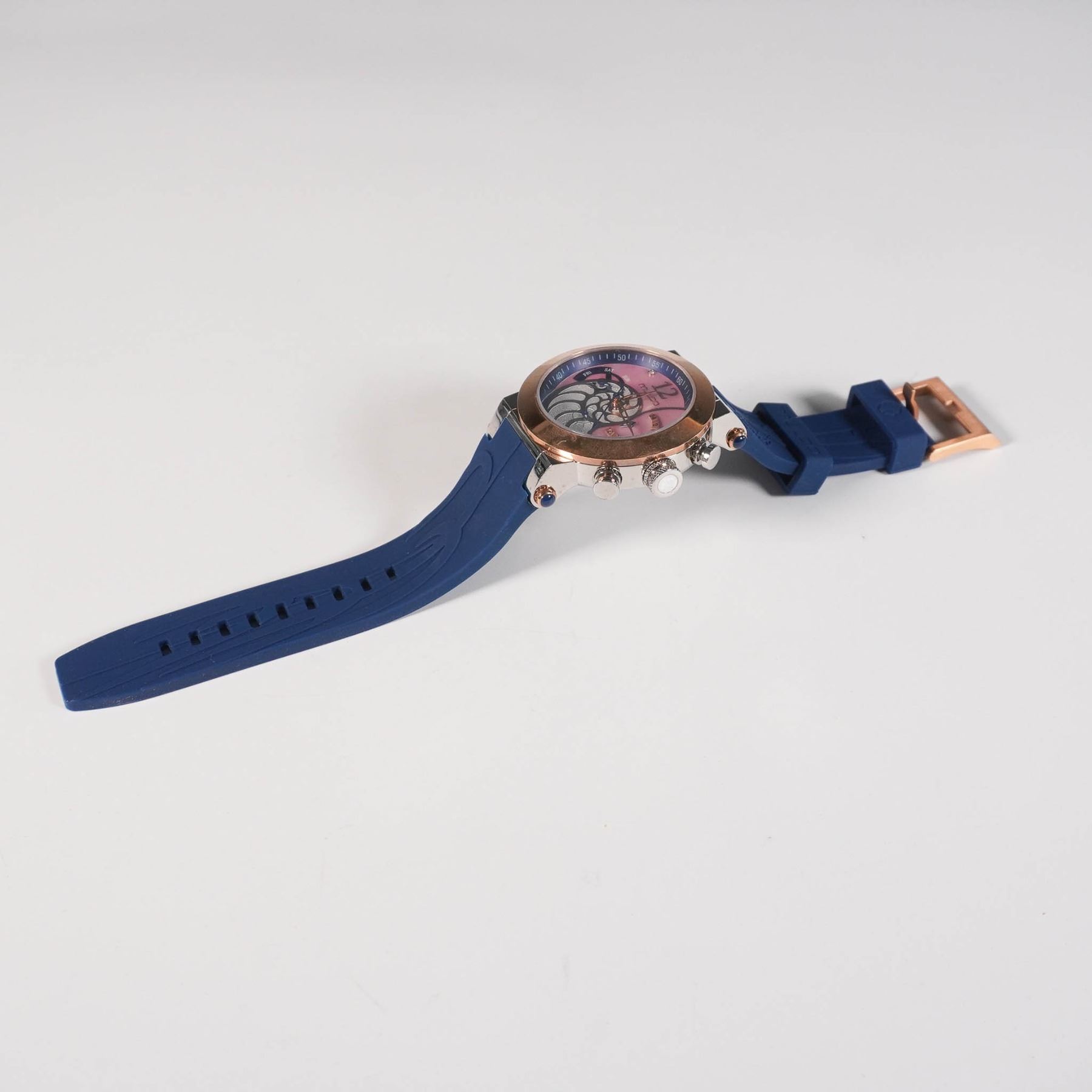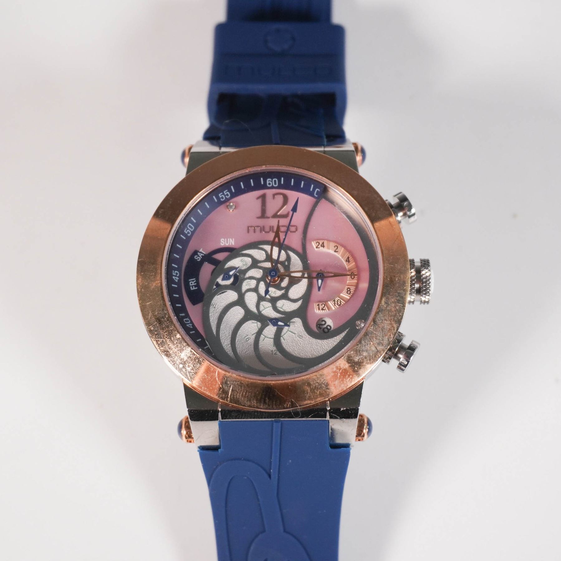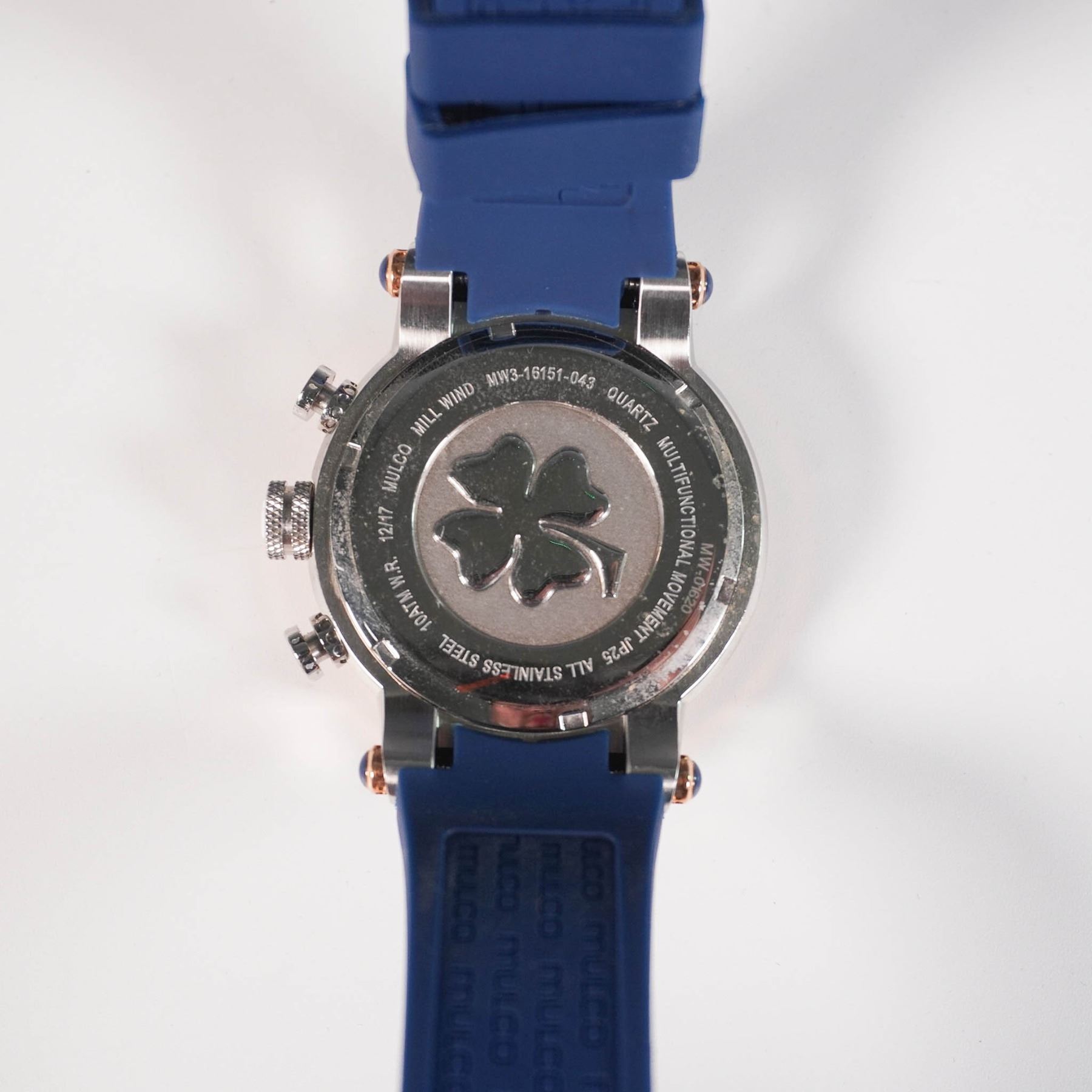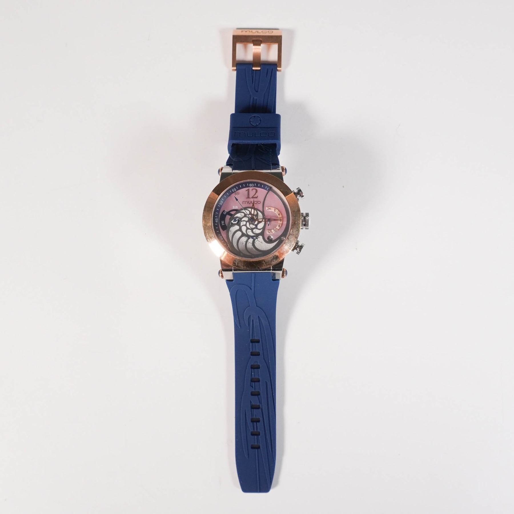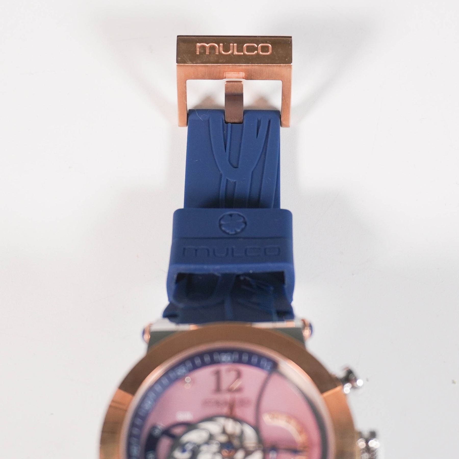 Mulco chronograph wristwatch, model MW3-16151-043, from the Millennia Mill Wind collection. This eye-catching timepiece features a rose gold-tone stainless steel case paired with a bold pink and silver nautilus-inspired dial. Functions include day, date, and 24-hour subdials with luminous hands. The watch is fitted with a textured blue silicone strap, embossed with the Mulco logo, and secured with a rose gold-tone tang buckle. Case back engraved with the Mulco four-leaf emblem, full model details, and stainless steel specifications.