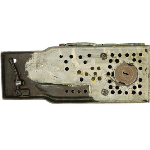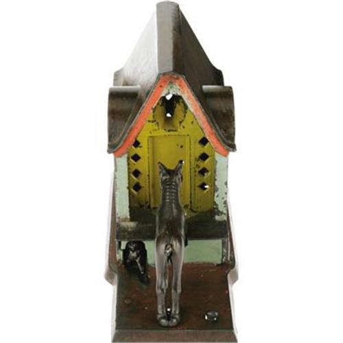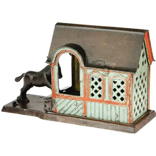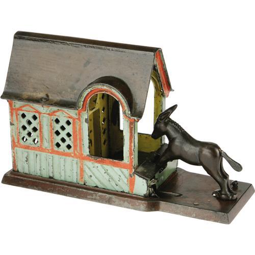 <B>Mule Entering Barn Cast Iron Mechanical Bank</B></I> made by J. & E. Stevens Company and patent dated 1880. Much of the polychrome painted surface retains its original luster. The coin is held by the mule's tail and cradled by his hind legs.When the trip underneath is released a small dog comes out supposedly to disturb the mule and send the coin flying into the slot in the barn. With only a replaced door on the trap, this clever bank, made to inspire children to save their coins by making it a game, presents in near mint condition.
