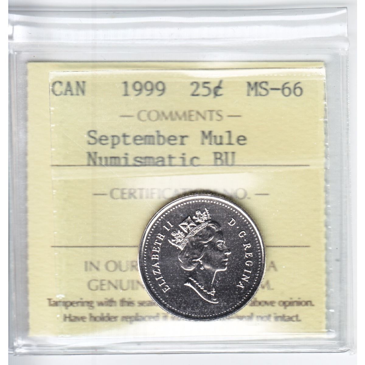 Mule Error 1999 September Canada 25-cent ICCS Certified MS-66 (missing the words "25 Cents") Buyers Premium will be added on all items as per our terms of sale. We accept Paypal, Credit Card, E-Transfer Payments, Cheque or Money Orders (there is an additional 3% fee for using Paypal or Credit Card). All invoices will be emailed immediately following the auction, please contact us if you would like to pay by credit card or receive a new revised lower total for mailing in payment or sending an e-transfer (3% discount). All Items Are Sold "AS IS", no returns