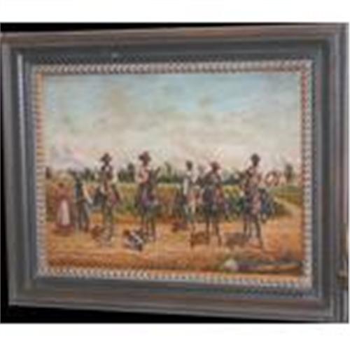 Handsome and unusual work of art. Signed by R. Neilson. Wonderful detail. A beautifully detailed oil painting by a contemporary artist. Handsome handcrafted frame with wonderful details. Dimensions are of the painting. 12x16 Framed oil on board - $395. 24x30 Framed oil on canvas - $895.